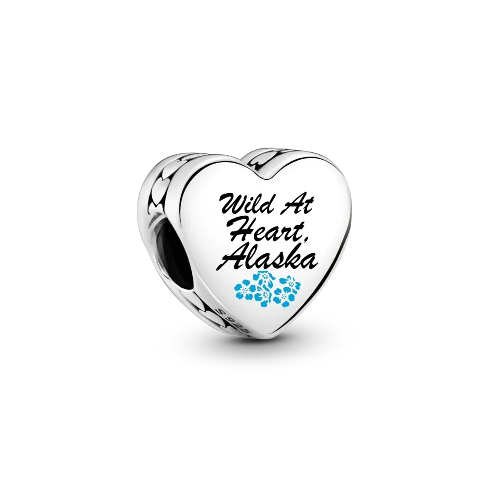 Dive into the beauty of Alaska’s wilderness, artfully depicted in colorful enamel on one side of this sterling silver heart-shaped charm. On the other side features “Wild At Heart, Alaska” scripted in black with delicate forget-me-nots underneath. A piece as beautiful as the land itself, carried with you always on a favorite Pandora bracelet or necklace.