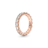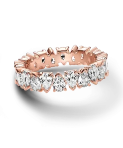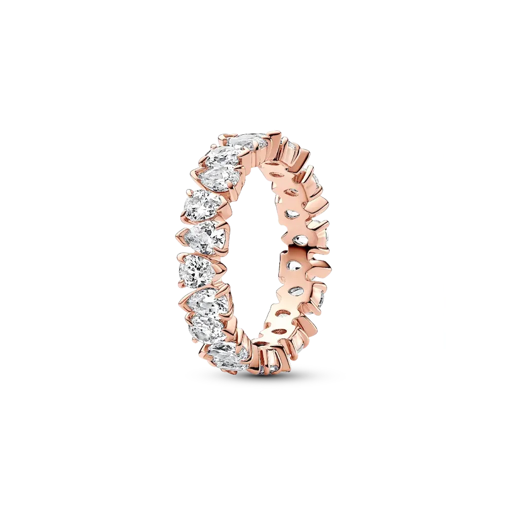 Put a fresh spin on a classic when you wear the Alternating Sparkling Band Ring. This 14k rose gold-plated ring features pear-shaped stones in alternating directions all the way around the band. Three prongs hold each stone in place, accentuating the pattern play and visual interest of the stones. Wear this ring as a statement piece on its own or stack it with other styles to enhance its striking silhouette.