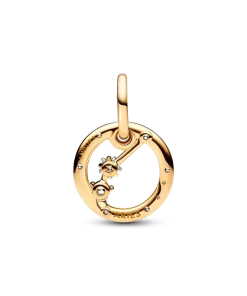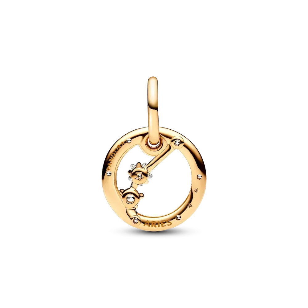 Let the stars guide your look with the Pandora Aries Zodiac Dangle Charm. This dangle charm is crafted our 14k gold-plated unique metal blend, has a circular outer frame and features clear sparkling cubic zirconia as well as the shape of the Aries zodiac sign. The back side of the frame is engraved with