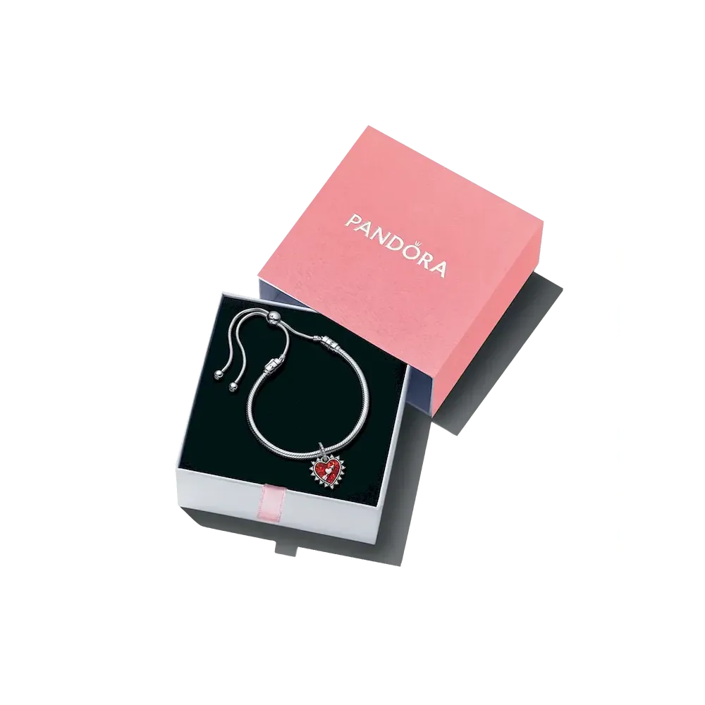 Let Cupid’s arrow guide you to the perfect gift set. Styled on our iconic sterling silver slider bracelet, a dazzling heart-shaped charm shines irresistibly in red lab-created opal. The center features a heart-shaped dial with a spinning arrow, pointing you in the direction of love. Follow your heart. Be love.