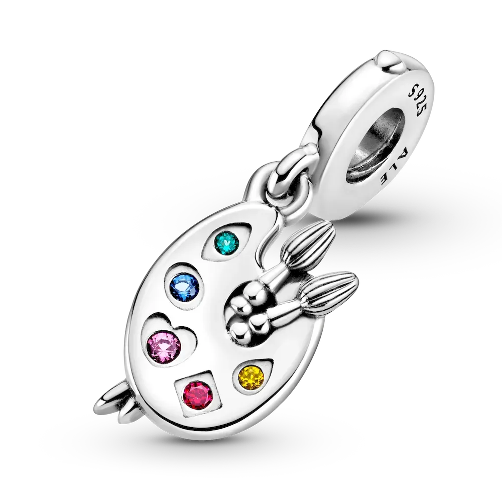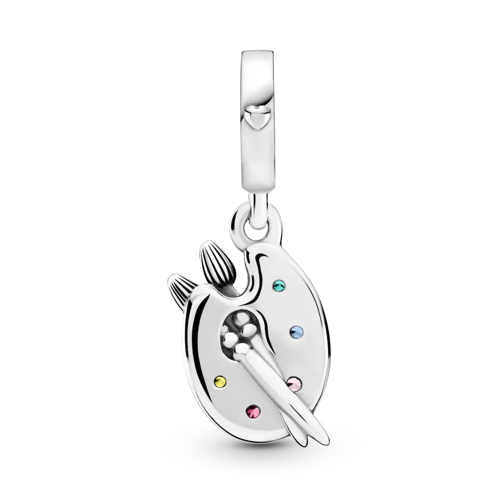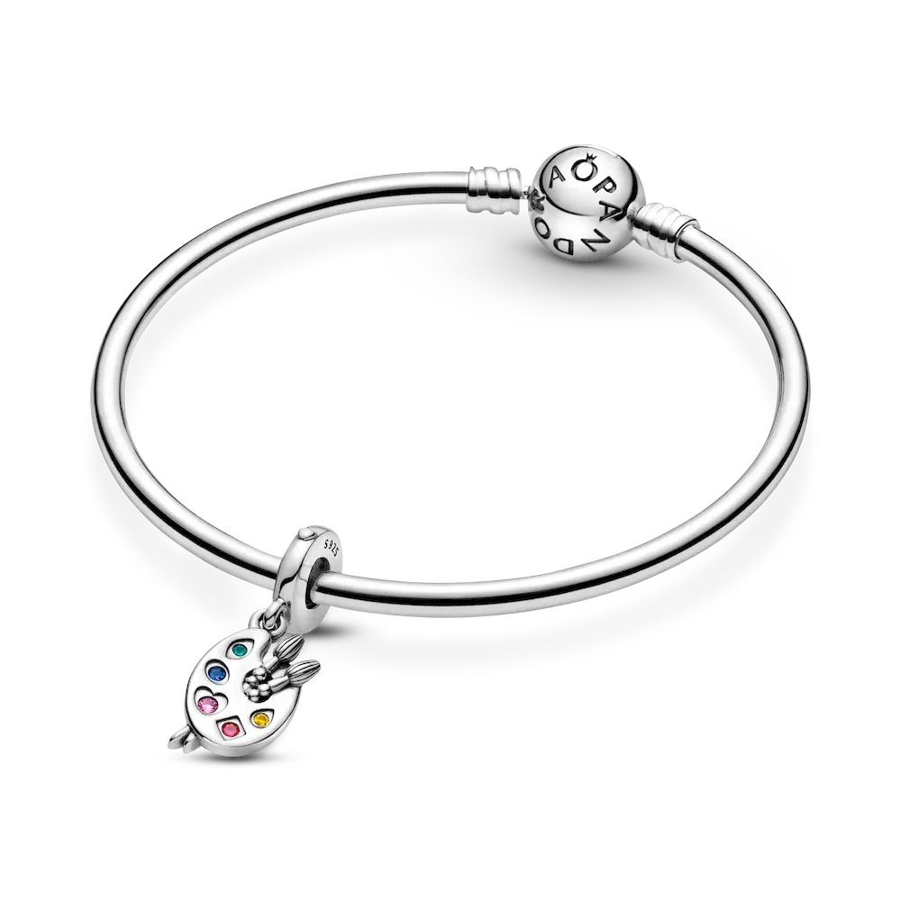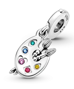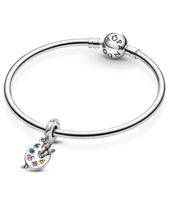 Express yourself with the Artist’s Palette Dangle Charm. Hand-finished in sterling silver, this colourful charm represents a 3D artist’s palette with five vivid paint colours represented by red cubic zirconia and pink, yellow, green and blue crystal stones. The creative charm also features two paint brushes with bristle details and sterling silver beads at the tail. Inspired by the idea of pursuing your passions and living your life creatively, let this charm be a reminder to embrace your unique point of view.