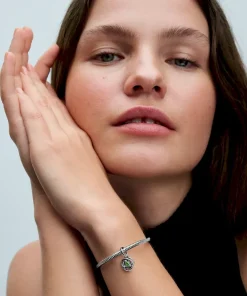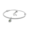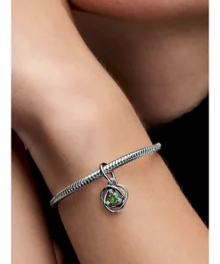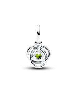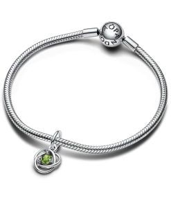 Introducing a new addition to the Eternity Circle family with our Stones of the Month dangle charms. Inspired by unconditional love and power, this intricate knot design features openwork infinity braiding around August’s Spring green man-made crystal at the center. Surrounded by three small cubic zirconia stones on the front and a cut-out heart shape on the back for maximum sparkle. This dazzling dangle charm comes on a matching sterling silver Pandora Moments Snake Chain Slider Bracelet. Capture the symbolism of an August birthday, milestone or anniversary with this precious set. Unconditionally. Infinitely. Be love.