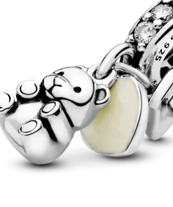 Whether you want to celebrate a new baby or show your love of the little things, our teddy bear charm adds a touch of whimsy to your bracelet style. This sterling silver dangle holds a trio of baby’s essentials: a plush teddy, a soothing dummy and a loving heart. It’s detailed with silver enamel and cubic zirconia stones. The charm makes for a perfect gift for a baby shower or a cute addition to your Pandora Moments bracelet as a personal reminder of a bundle of joy in your life.