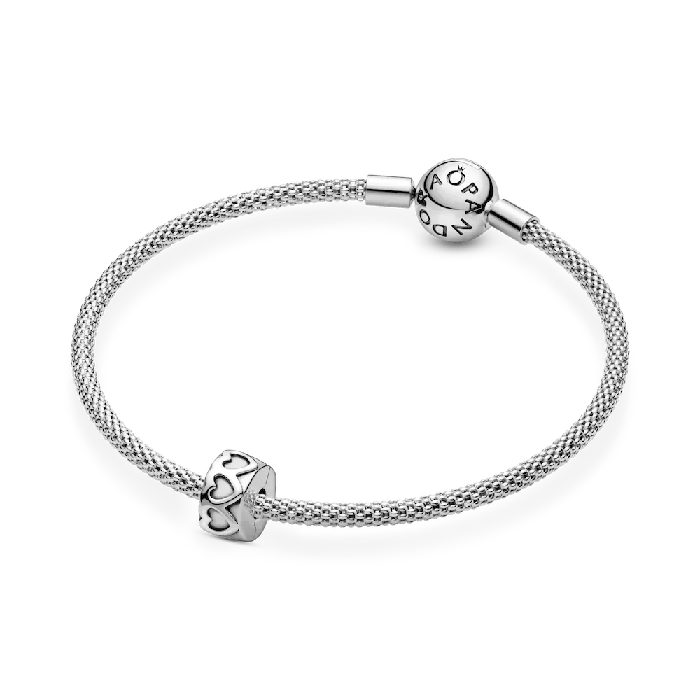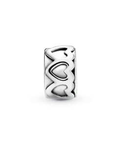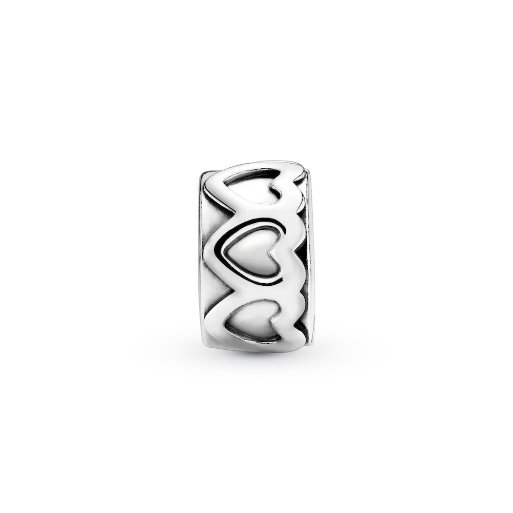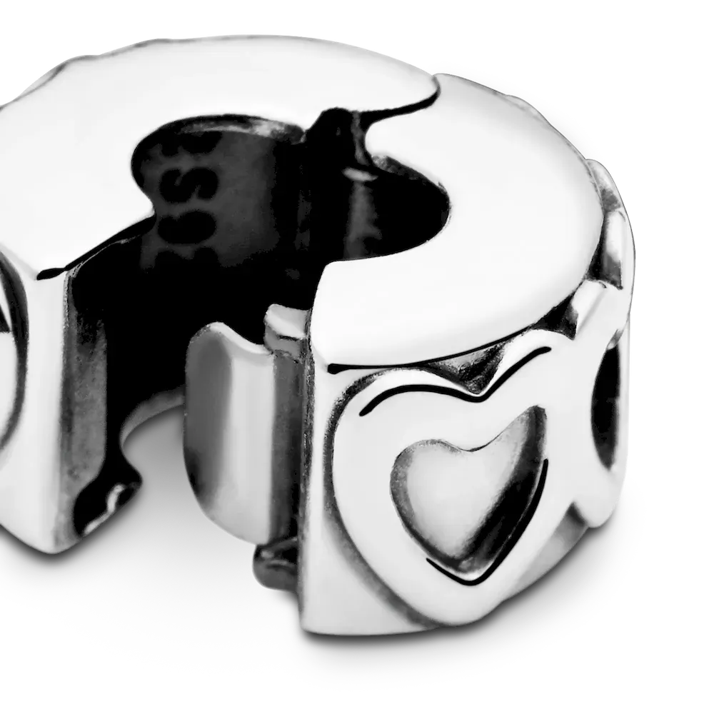 Add meaning to your Pandora Moments bracelet with this hand-finished sterling silver clip charm featuring heart details. A row of romantic hearts channel the look of love and the raised design lends subtle dimension to your charm stack. Wear this hand-finished piece with other sterling silver charms as part of your charm stack or gift it to someone that’s close to your heart. This clip charm features no silicone grip, so it will slide if not styled onto threads (two raised charm dividers).