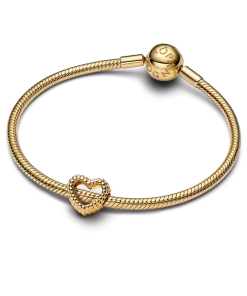 Feel the love with our 14k gold-plated Beaded Open Heart Charm, perfect for adding depth and dimension to a charm bracelet. The open design is minimally detailed with a beaded silhouette. Thread it on a favorite Pandora Moments bracelet or bangle, adding other pieces that tell your story in a way that’s uniquely you.