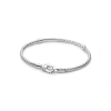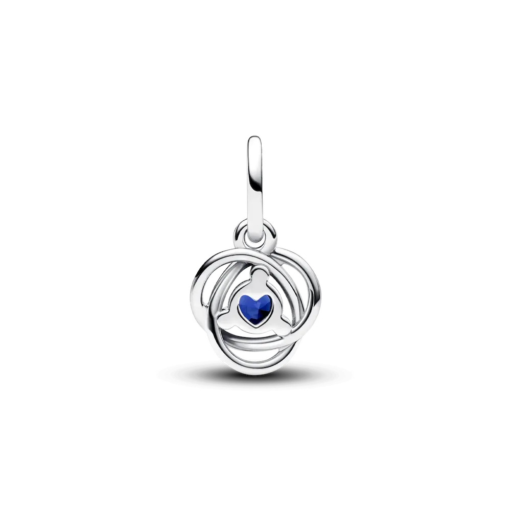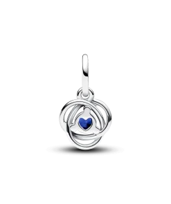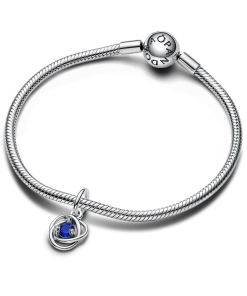 This intricate Blue Eternity Circle Dangle Charm is a must-have infinity charm for your Pandora Moments collection. Crafted in lustrous sterling silver, it features an openwork infinity braid decorated with a central blue man-made crystal, elegantly surrounded by three clear cubic zirconia. The intricate design symbolizes eternity and adds an additional layer of meaning to the piece. Elevate your bracelet with this essential piece or gift it as a representation of an everlasting bond.