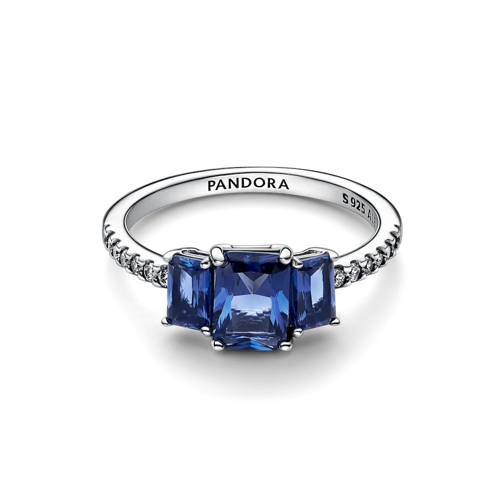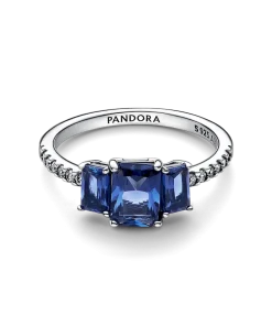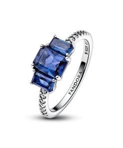 Elevate any look with the Blue Rectangular Three Stone Sparkling Ring. Crafted from sterling silver, this hand-finished ring is set with three rectangular radiant-cut princess blue man-made crystals. A row of clear cubic zirconia pavé runs along the band to give the ring a delicate, sophisticated look. Wear yours solo or stack it with other styles to make an elegant statement.