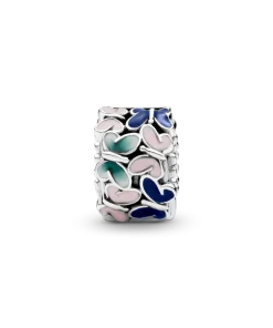 Add a dose of color to your look with this clip charm hand-finished in sterling silver. Detailed with a swarm of butterflies, the meaningful charm features vibrant hand-applied enamel. It’s the perfect piece to create a garden-inspired look on your favorite bracelet. Wear the clip charm to help you evenly space your chosen charms with style. This clip charm features no silicone grip, so it will slide if not styled onto threads (two raised charm dividers).