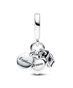 One for the dreamers and explorers. Wear the Camera, Heart & Compass Triple Dangle Charm to carry your favorite travel memories on your jewelry. This sterling silver triple dangle features a camera with a sparkling stone as the lens, a heart-shaped map of the world with blue and green gradient enamel and a compass with a fixed orienteering arrow.