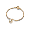 Let the stars guide your look with the Pandora Cancer Zodiac Dangle Charm Bracelet Set. The dangle is crafted from our 14k gold-plated unique metal blend, has a circular outer frame and features clear sparkling cubic zirconia as well as the shape of the Cancer zodiac sign. The back side of the frame is engraved with
