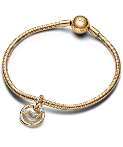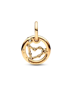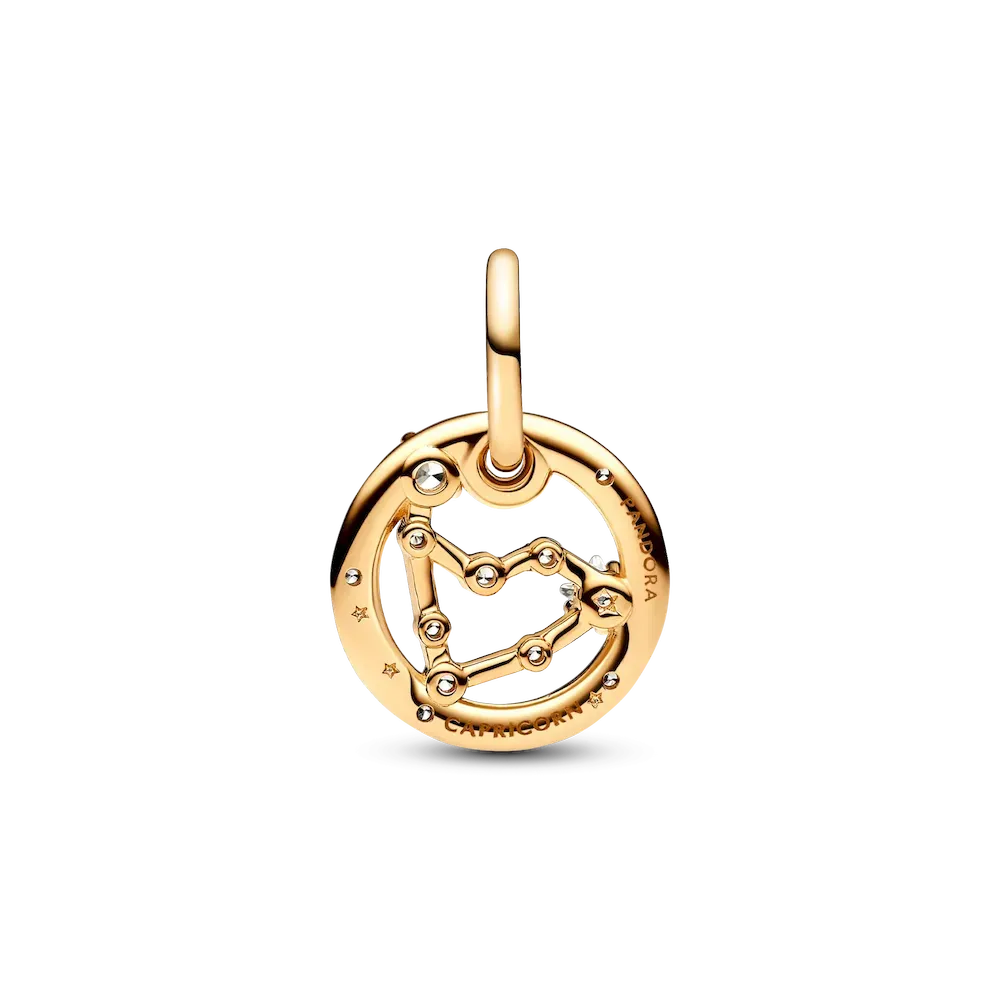 Let the stars guide your look with the Pandora Capricorn Zodiac Dangle Charm. This Capricorn charm is crafted our 14k gold-plated unique metal blend, has a circular outer frame and features clear sparkling cubic zirconia as well as the shape of the Capricorn zodiac sign. The back side of the frame is engraved with