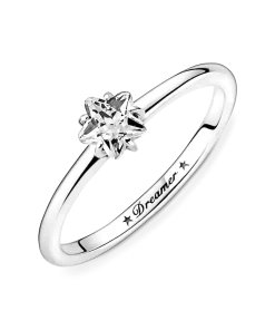 Bring starry sparkle to your outfits with the Celestial Sparkling Star Solitaire Ring. Inspired by celestial beauty, the sleek sterling silver ring features a center star-shaped clear cubic zirconia stone and is complemented by two asymmetric stars and the word