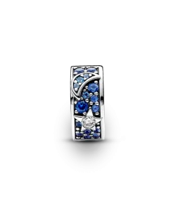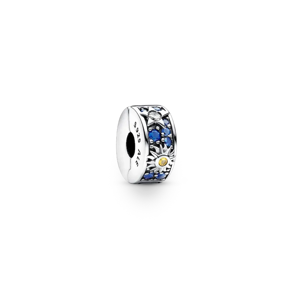Wear the power of symbols with the Celestial Sun, Star & Moon Clip Charm. This sterling silver clip charm is inspired by the mysterious beauty of the universe, combining sun, moon and star motifs brought to life with sparkling stones in clear, yellow and deep blue tones. It’s lined with silicone so it stays in place on your chain and does not fit over threaders (raised bracelet dividers). The perfect finishing touch to your celestial bracelet styling.