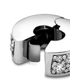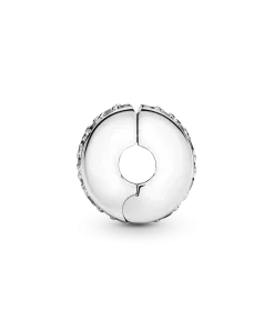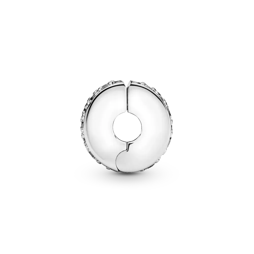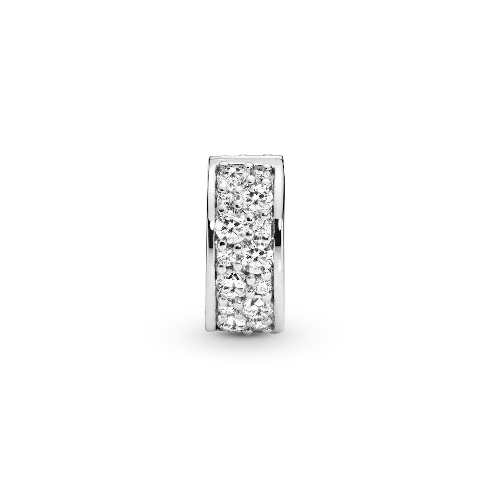 Add a touch of sparkle while securing your Pandora charms with this shimmering clip, crafted in sterling silver with cubic zirconia stones. A stylish way to complete your bracelet, Pandora clips can be used to create sections and feature a hidden silicone grip that keeps charms perfectly in place. This pavé style can be paired with Pandora bangles, snake chain necklaces and most bracelets. This clip charm features a silicone grip, does not fit onto threads (two raised charm dividers.) This charm can be styled anywhere else on the bracelet.