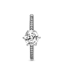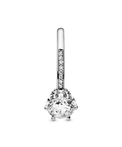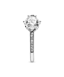 Bring an explosion of sparkle to your outfits with the sterling silver Clear Sparkling Crown Ring. The claw setting of the large clear cubic zirconia creates the effect of a regal crown on the solitaire ring and is complemented by additional small stones set along the ring band. A ring that’s fit for the special princess or queen in your life, it can be paired with most other selections from the Pandora collection for a truly regal look.