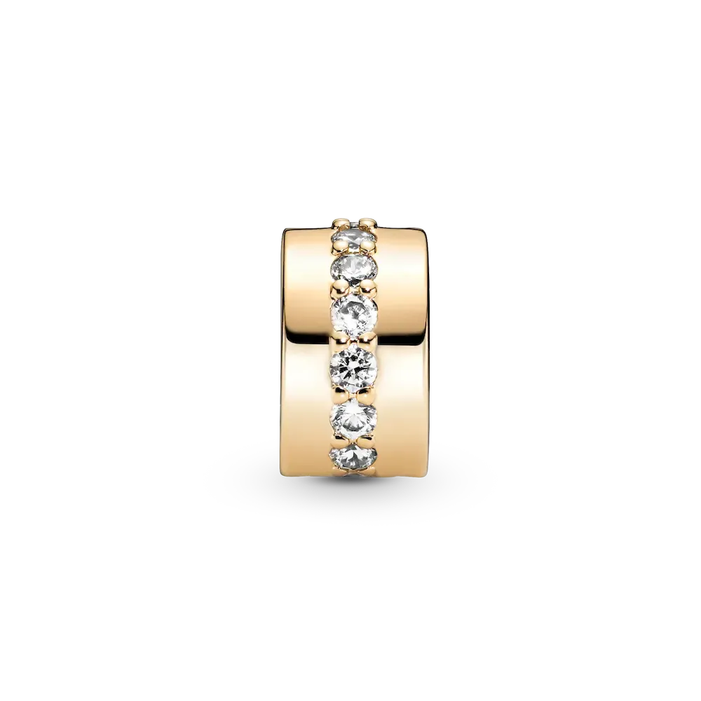 Add a touch of sparkle to your look with the Clear Sparkling Row Clip Charm. Hand-finished in 14k gold, this design features a line of clear cubic zirconia that runs around its middle. Wear this clip charm on your favorite bracelet on its own to make a statement. Alternatively, offset the warm tone of this piece by teaming it with shimmering sterling silver designs for an eye-catching, contrasting finish. This clip charm features no silicone grip, so it will slide if not styled onto threads (two raised charm dividers).