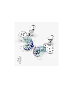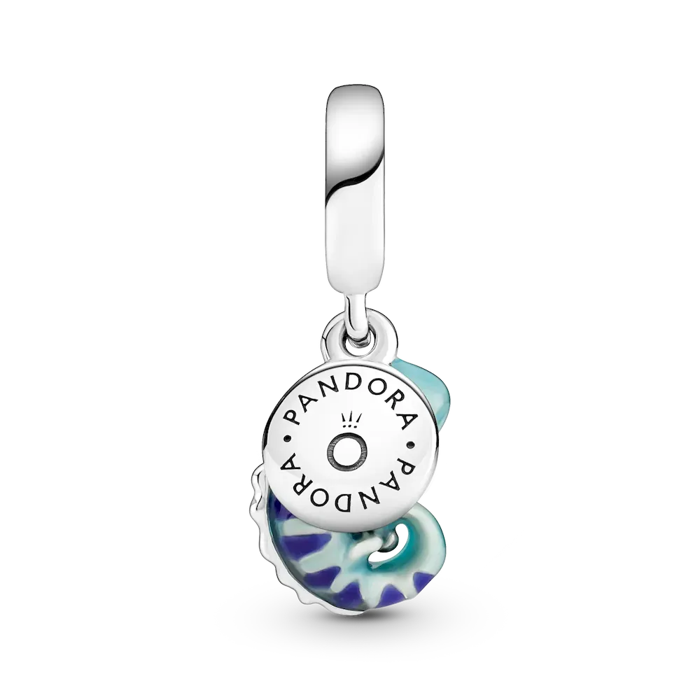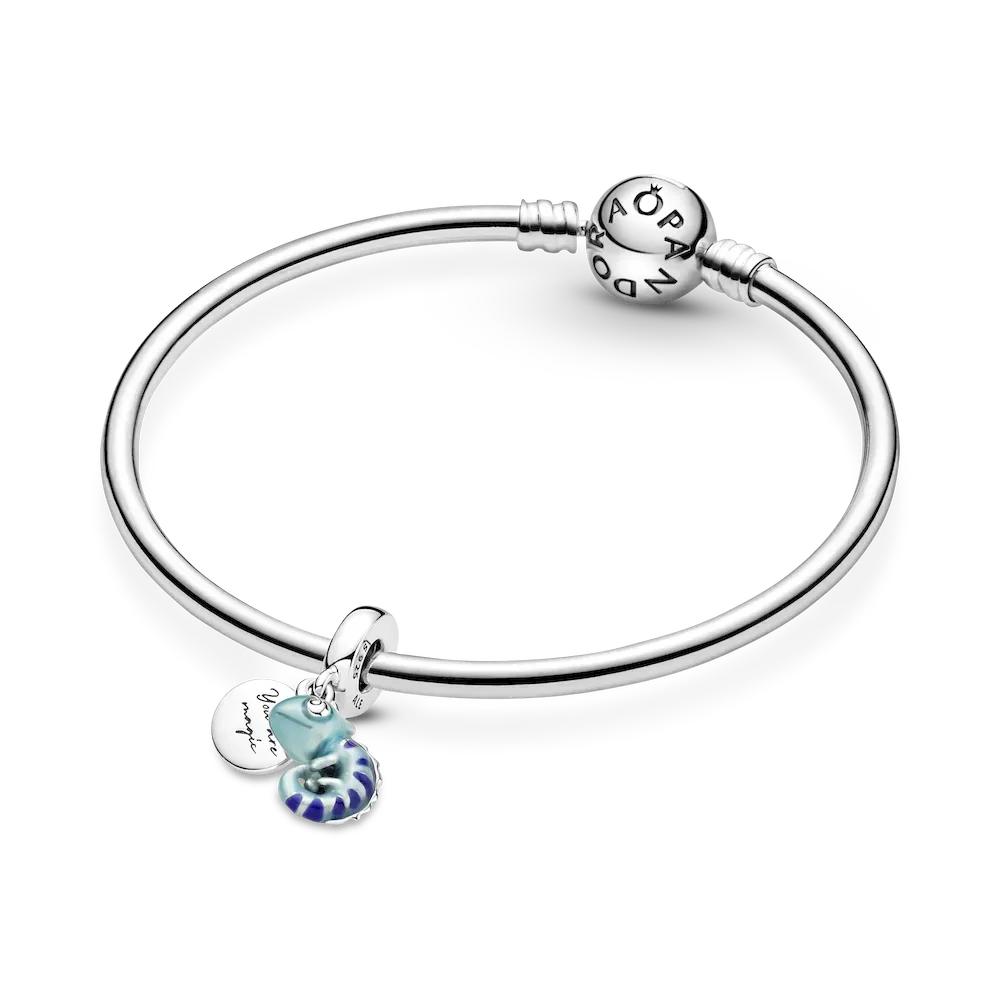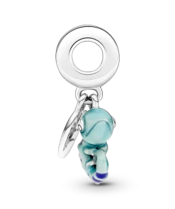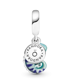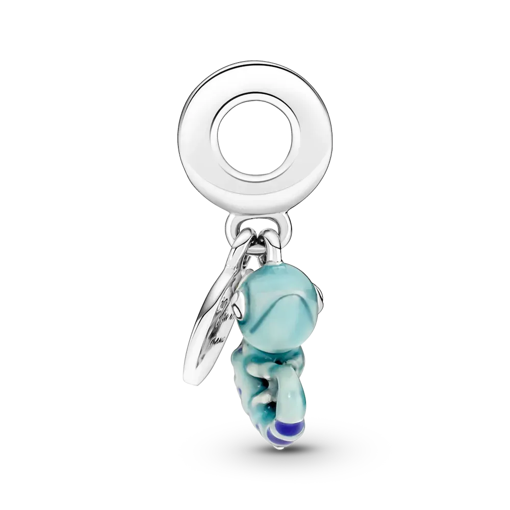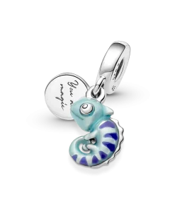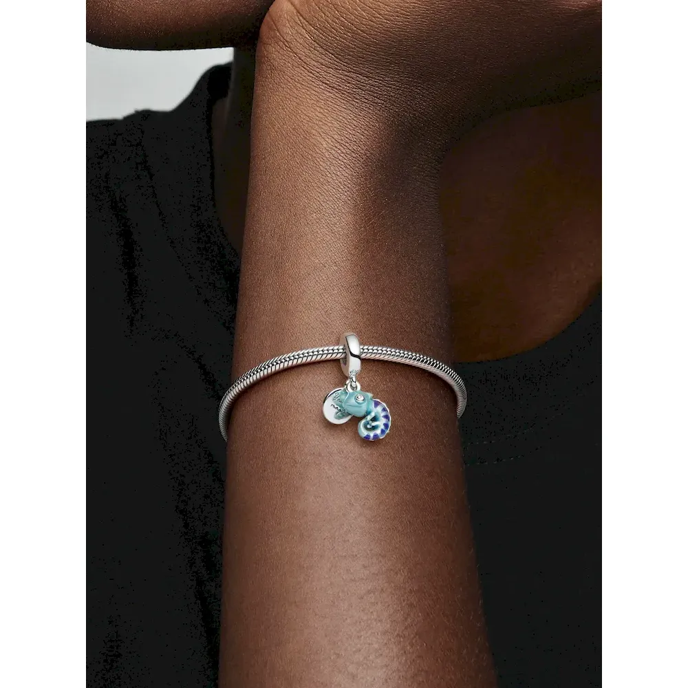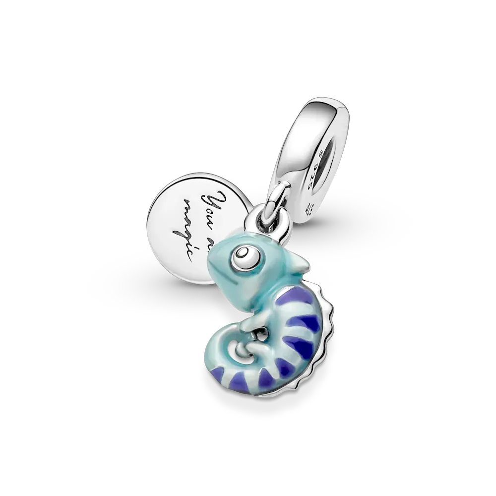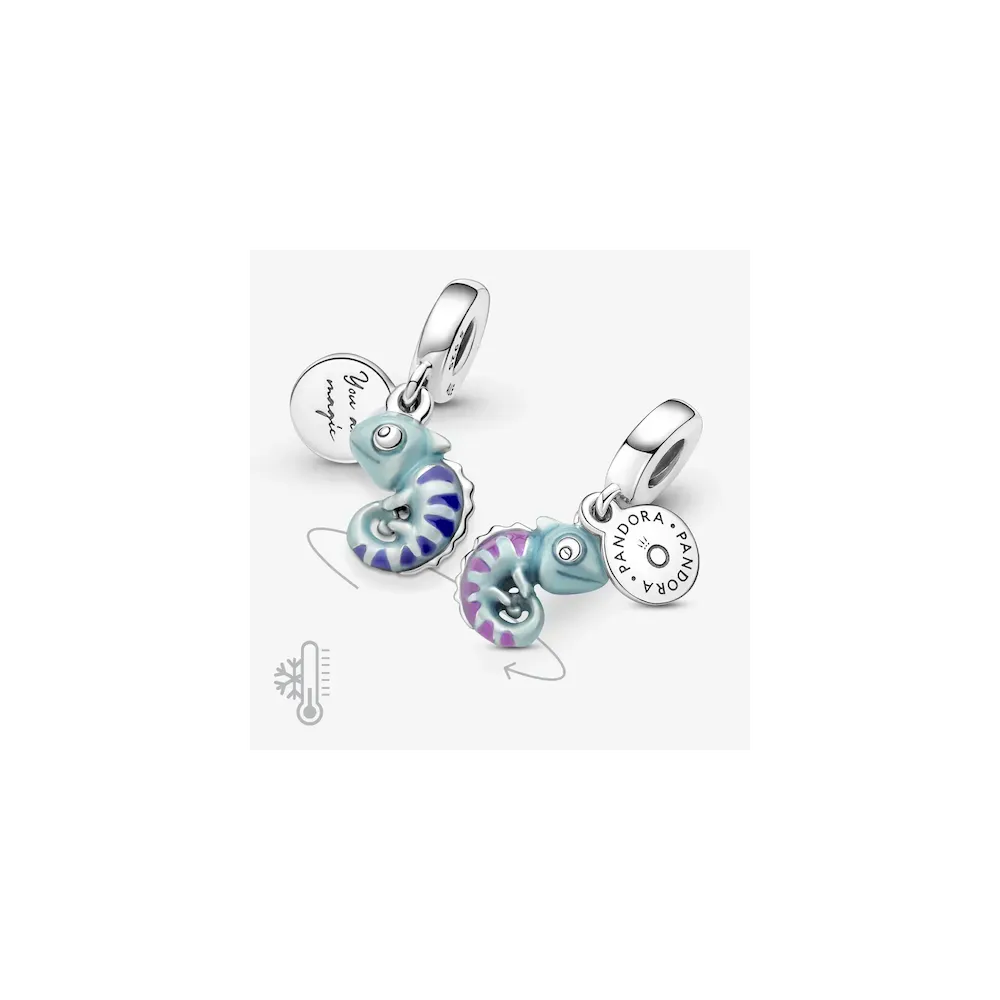 A symbol of adaptability and change, this transformational chameleon reminds you to live life in its full spectrum of colors. Made from sterling silver, the chameleon dangle charm features a special thermochromic enamel which changes color in response to temperature changes, ranging from light teal to deep blue on the body and dark purple to pink on its stripes. A small sterling silver disc attached to the bail has the words