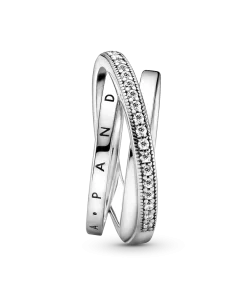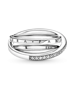 Go for linear layers with the Crossover Pavé Triple Band Ring. This Sterling Silver ring features three bands, with one diagonally overlapping the other two. One inner band has the Pandora logo, the other inner band is polished and the outer band features clear cubic zirconia pavé framed by micro-beading. All three bands merge at the back of the ring shank. Inspired by the spiral structure of the solar system, this ring brings a sleek, structural sophistication to any look.