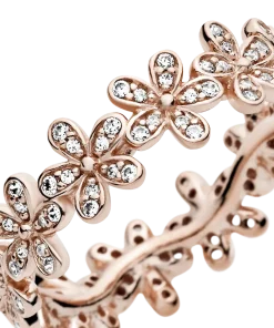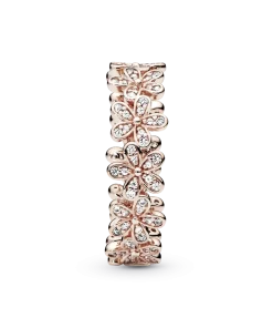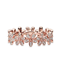 Wrap your finger in flowers with this dazzling Daisy Flower Ring plated with 14k rose gold. Evoking feelings of joy and happiness, the delicate chain of daisies is adorned with shimmering cubic zirconia stones that catch the light. Wear it solo for everyday elegance, or with the Pandora Daisy Earrings and matching necklace for a fabulous floral look.