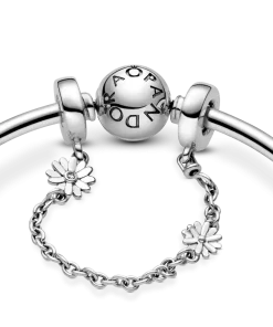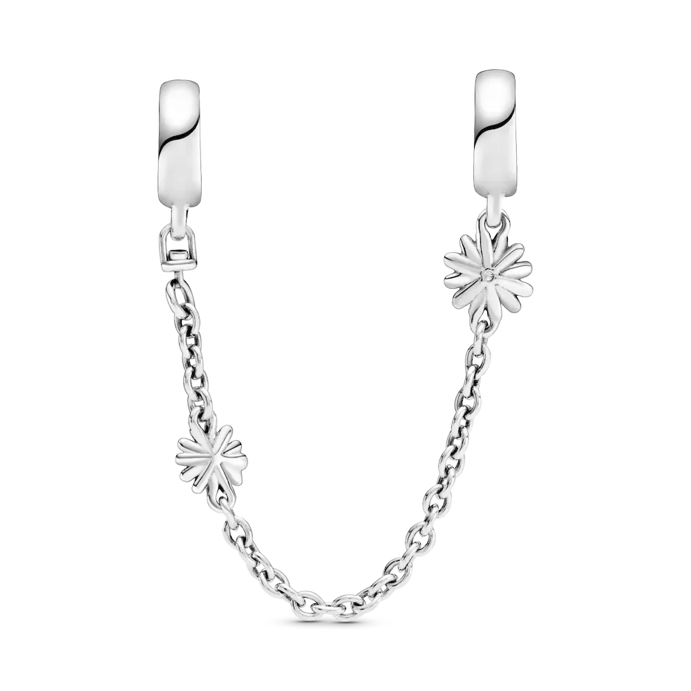 Keep your spring charm collection in place with the Pandora Moments Daisy Flower Safety Chain Charm. With two different-sized daisy flower details, the sterling silver safety chain makes sure that your charms stay safely on your Pandora Moments bracelet, while looking fresh and stylish. Featuring a single cubic zirconia for added sparkle, the daisy safety charm is inspired by the bold and freedom-loving symbolism of the delicate flower. Pair with other floral charms for the ultimate spring-inspired look.