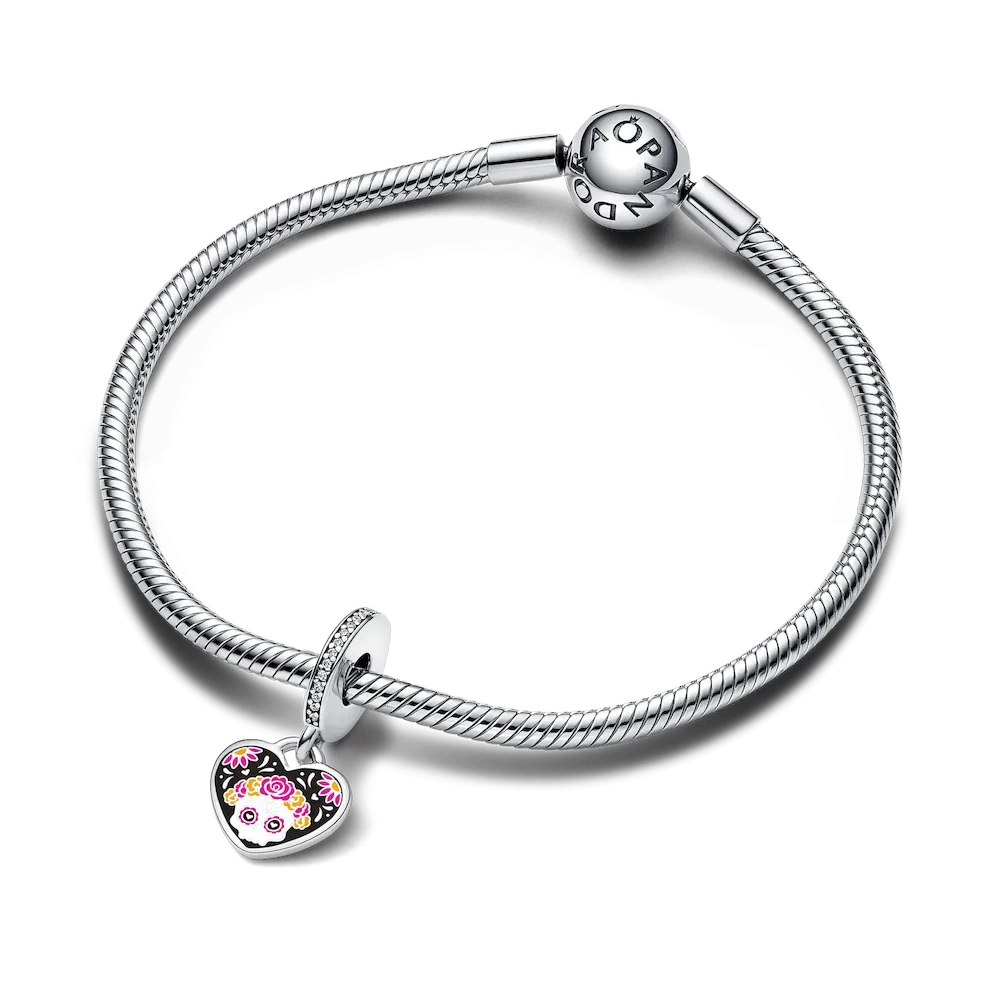 Celebrate the spirit of Día de los Muertos with the Day of the Dead Sugar Skull Charm. This heart-shaped dangle charm is beautifully crafted in sterling silver and features a row of sparkling cubic zirconia on the bale, adding a touch of sparkle. The heart itself is engraved with a traditional sugar skull design, complete with a colorful flower crown, and adorned in vibrant shades of black, pink, and orange. A meaningful tribute to the tradition of honoring loved ones, this charm is perfect for bringing joy and remembrance to your collection.