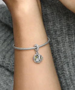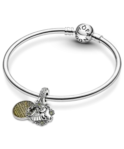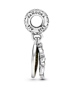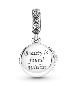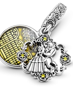 Enter the magical world of Disney’s Beauty and the Beast with this evocative double dangle charm. Disney’s Belle and the Beast dance within an openwork frame surrounded by roses set with man-made yellow crystals. The ballroom is depicted in a background disc in transparent yellow hand-applied basse-taille enamel technique. The bail features 3D rose details. Commemorating the imperfect but magical love between Belle and the Beast, the dangle charm is engraved with the phrase “Beauty is found Within”.