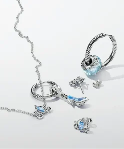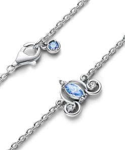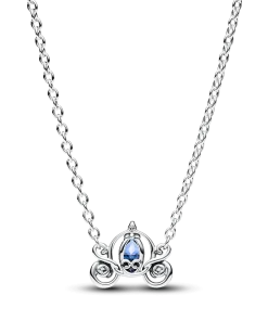 Follow the call of the ball with the Disney Cinderella’s Carriage Collier Necklace from Disney x Pandora. This sterling silver necklace features an intricate pendant inspired by Cinderella’s enchanted pumpkin carriage, with a blue marquise-shaped stone surrounded by swirling openwork details. Small cubic zirconia stones sparkle on the wheels and pumpkin stem. The pendant is fixed to the chain, and the necklace is adjustable to three lengths. Style it together with the matching stud earrings for an elevated Cinderella-inspired look.