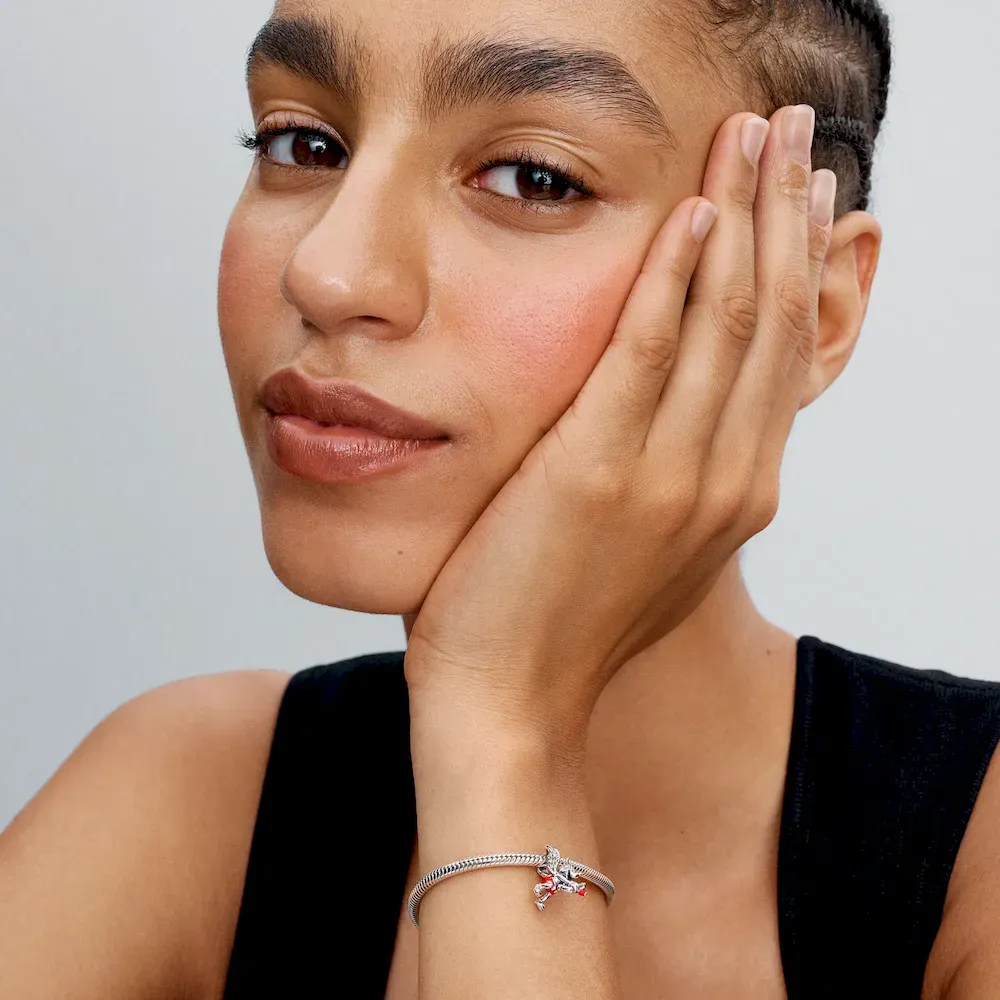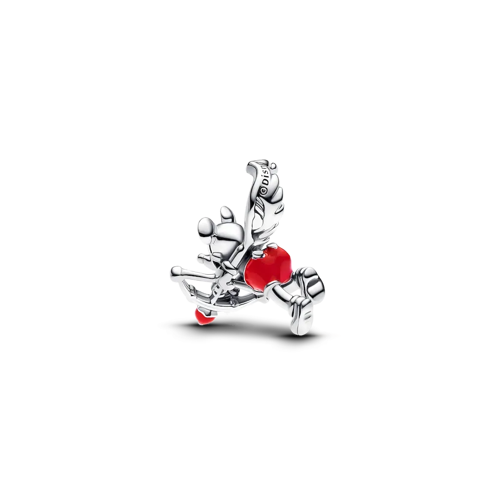 Love Disney’s Mickey Mouse? There’s a charm for that. Made from sterling silver, this romantic, playful design features vibrant red enamel on Disney’s Mickey’s signature shorts and the heart-shaped tip of his arrow. The bail is shaped as his wings, adding a whimsical touch, and the charm is engraved with the ©Disney logo. A unique opportunity to collect Disney’s Mickey Mouse as cupid, this charm celebrates the joy of love and the magic of Disney.