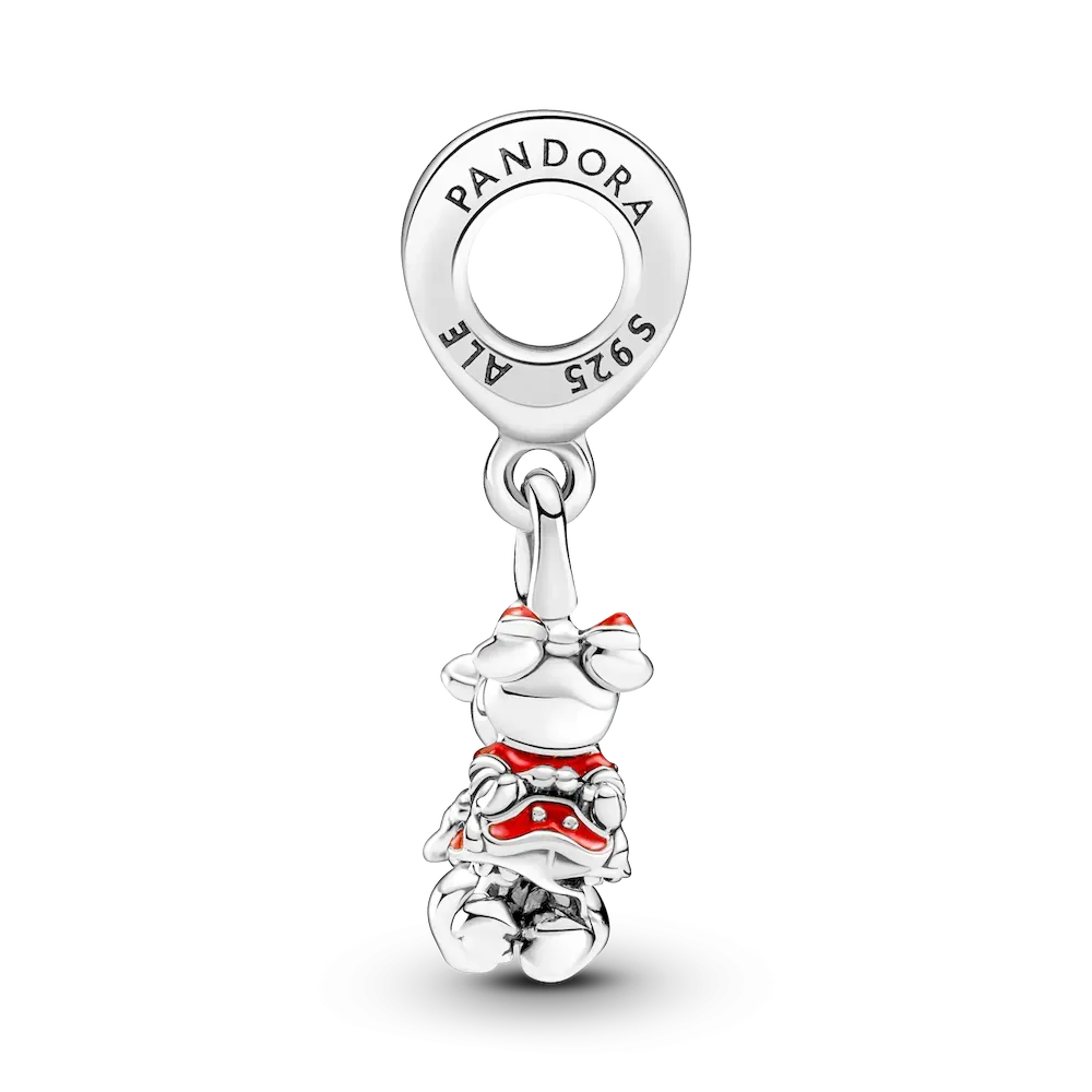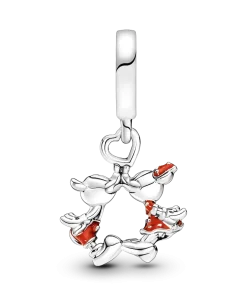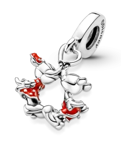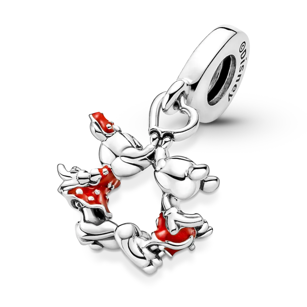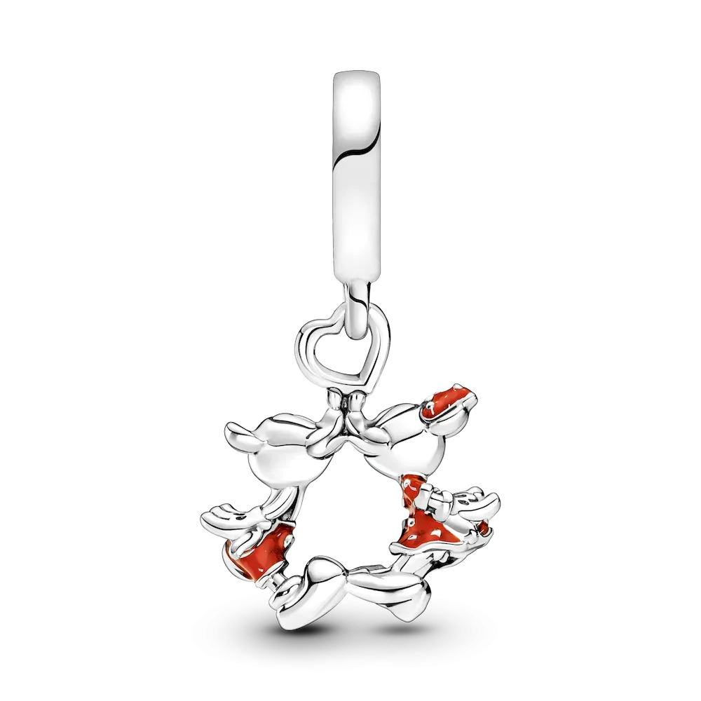 This Disney Mickey & Minnie Mouse Kissing Dangle Charm celebrates romance with one of the most iconic couples in the world. The cute kissing couple are hand-finished in sterling silver and decorated with red enamel and sterling silver beading. This adorable Disney x Pandora charm represents a happily ever after and would make a special gift for the one you love.