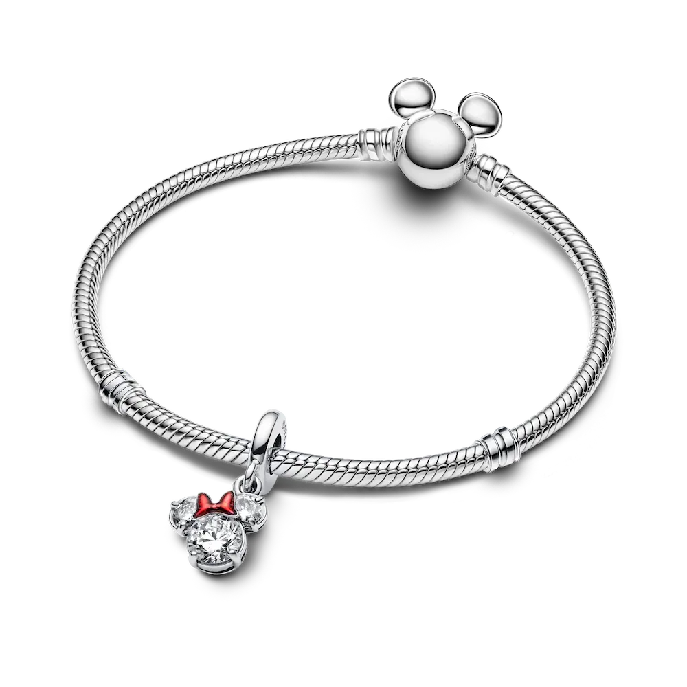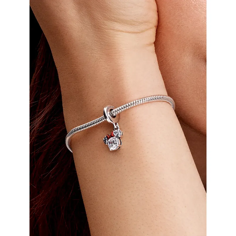 Add a touch of Disney magic to your collection with our Disney Minnie Mouse Silhouette Dangle Charm. Featuring three sparkling stones arranged in Minnie Mouse’s silhouette and her iconic red bow in glittery enamel, this sterling silver charm is the perfect holiday gift for yourself or someone special.