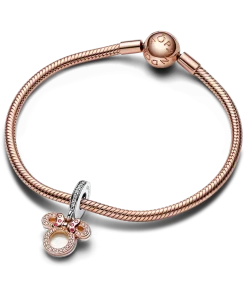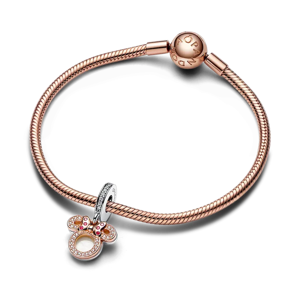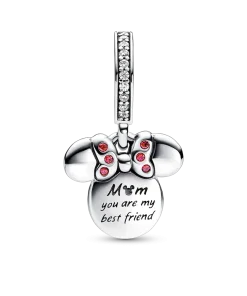 Celebrate a mom who’s your best friend with Disney’s Minnie Mouse. The Disney Minnie Mouse Silhouette Double Dangle Charm features two discs shaped like the iconic Minnie Mouse head silhouette – at the front is an openwork silhouette in 14k rose gold plating set with glittering clear pavé and finished with Minnie’s signature bow with red cubic zirconia stones. Behind it is a sterling silver dangle engraved with the message