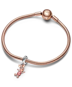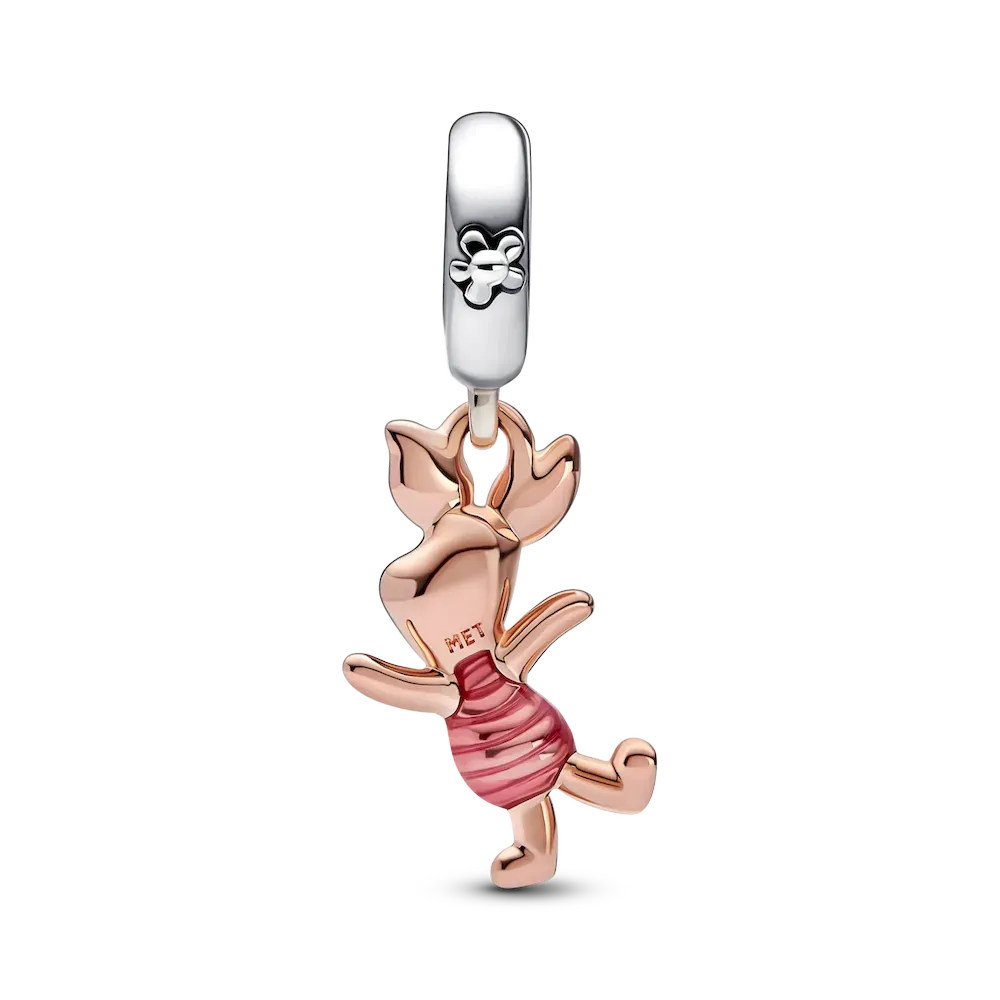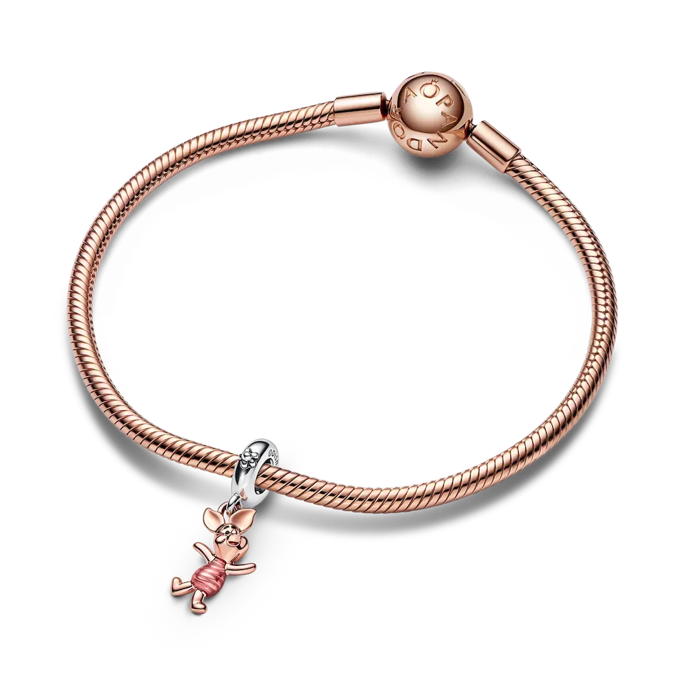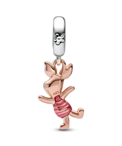 Do a happy dance with Disney’s Piglet, Winnie the Pooh’s best friend. The Winnie the Pooh Piglet Dangle Charm sterling silver dangle charm depicts little Piglet in a joyful pose, brought to life with 14k rose gold plating and transparent pink enamel over grooved lines to recreate his striped suit. The sterling silver bail features a small raised flower on either side. Style Piglet on your Pandora Moments bracelet or charm holder as a reminder of the best of friends and the best of times.