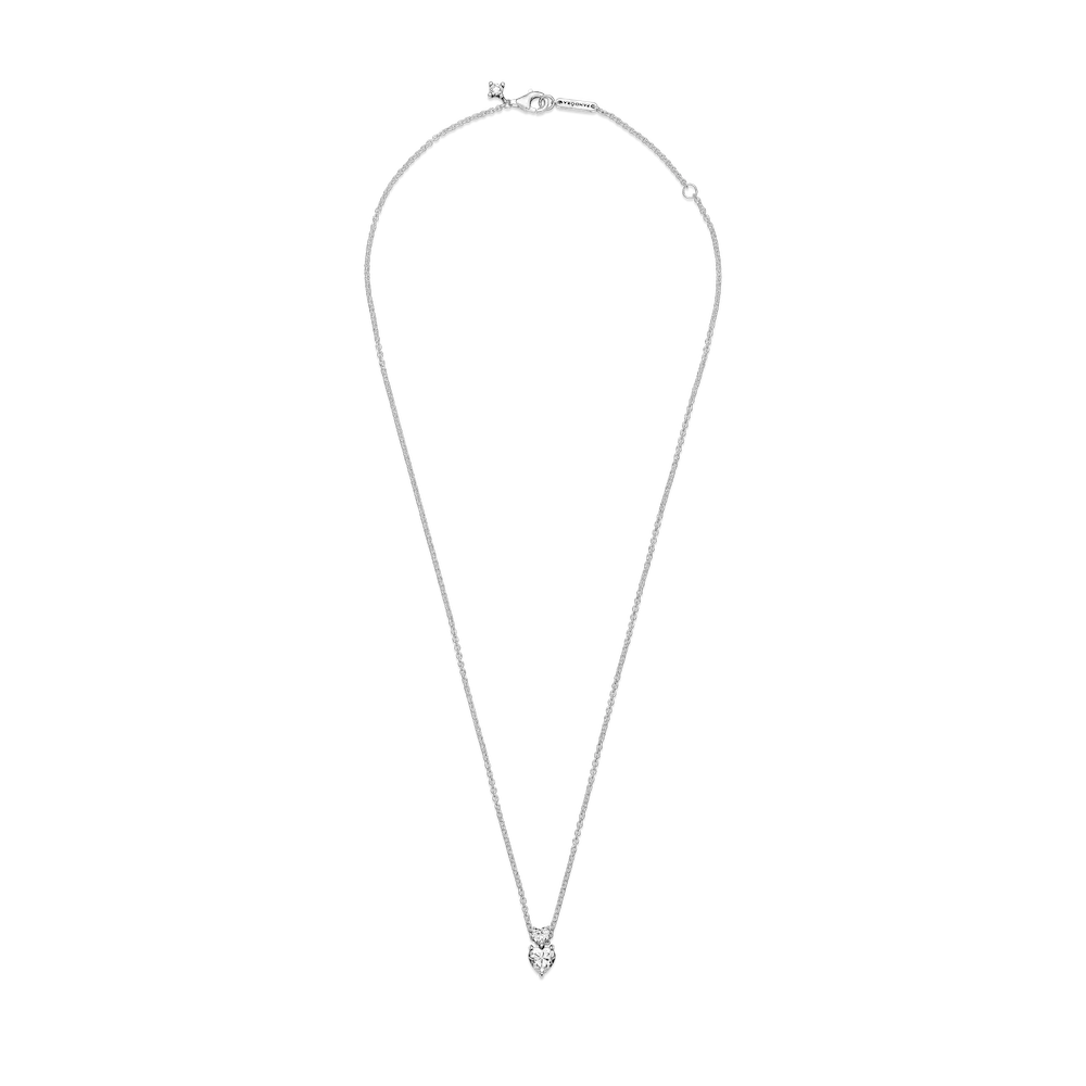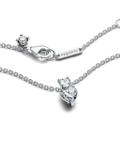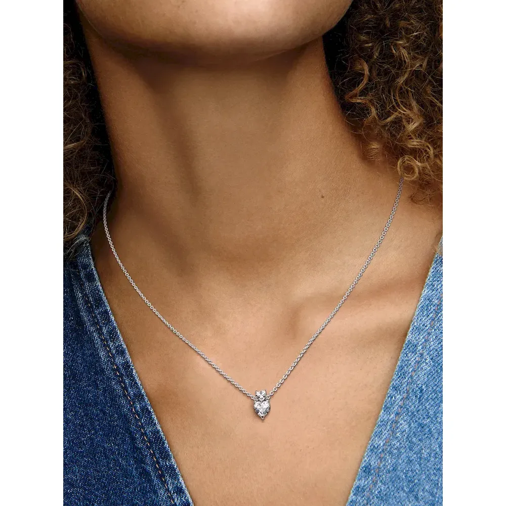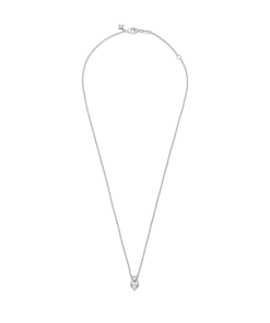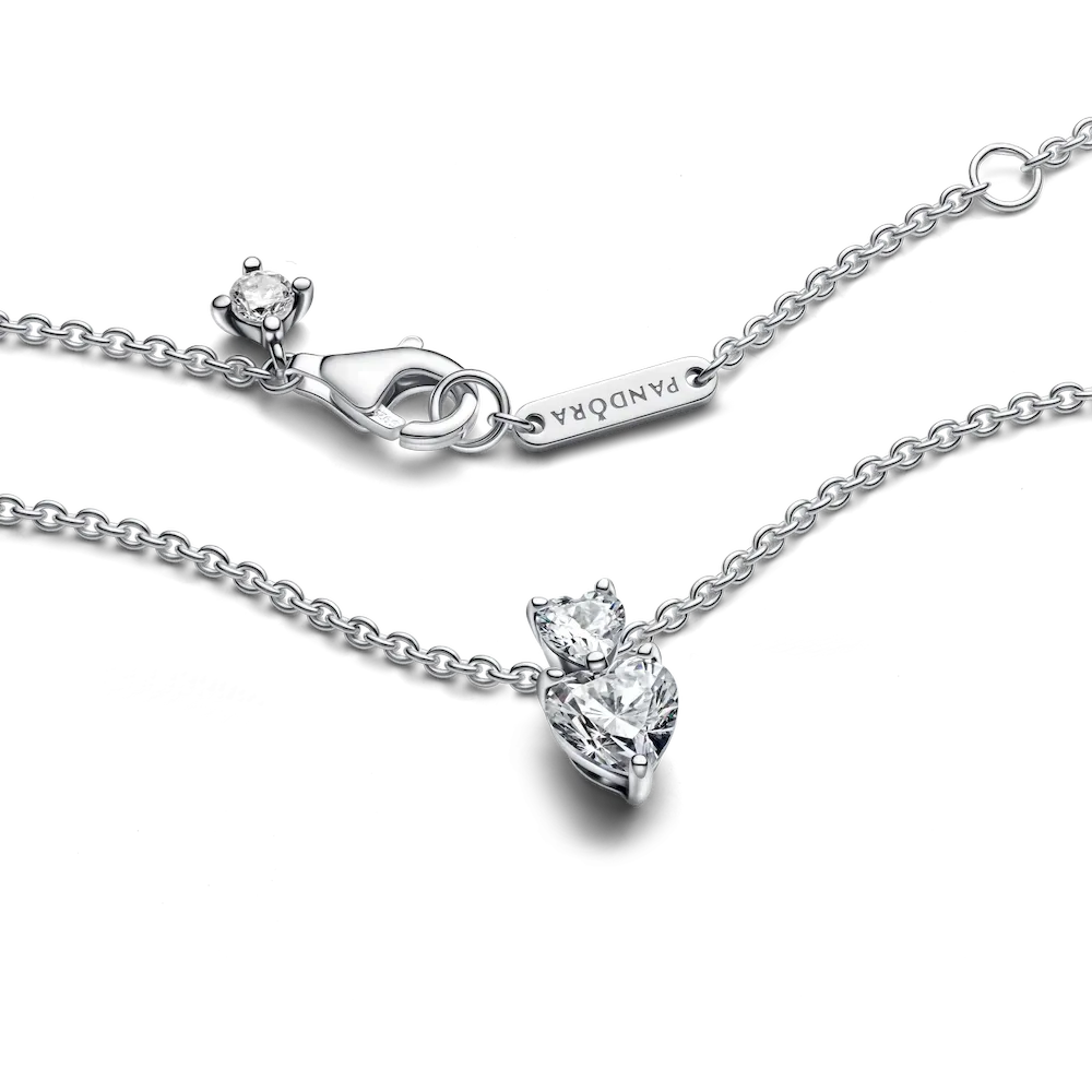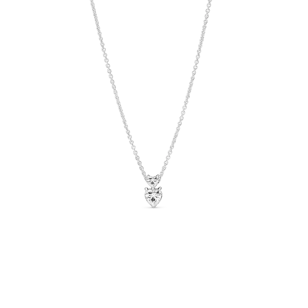 Two hearts beat as one in this timeless design. The Double Heart Pendant Sparkling Collier Necklace features two heart-shaped stones of different sizes, the smaller of which connects the pendant to the necklace. A small round cubic zirconia stone sparkles beside the lobster clasp. The chain length is adjustable, making this a versatile finishing touch to your outfit.