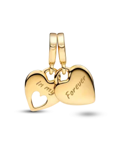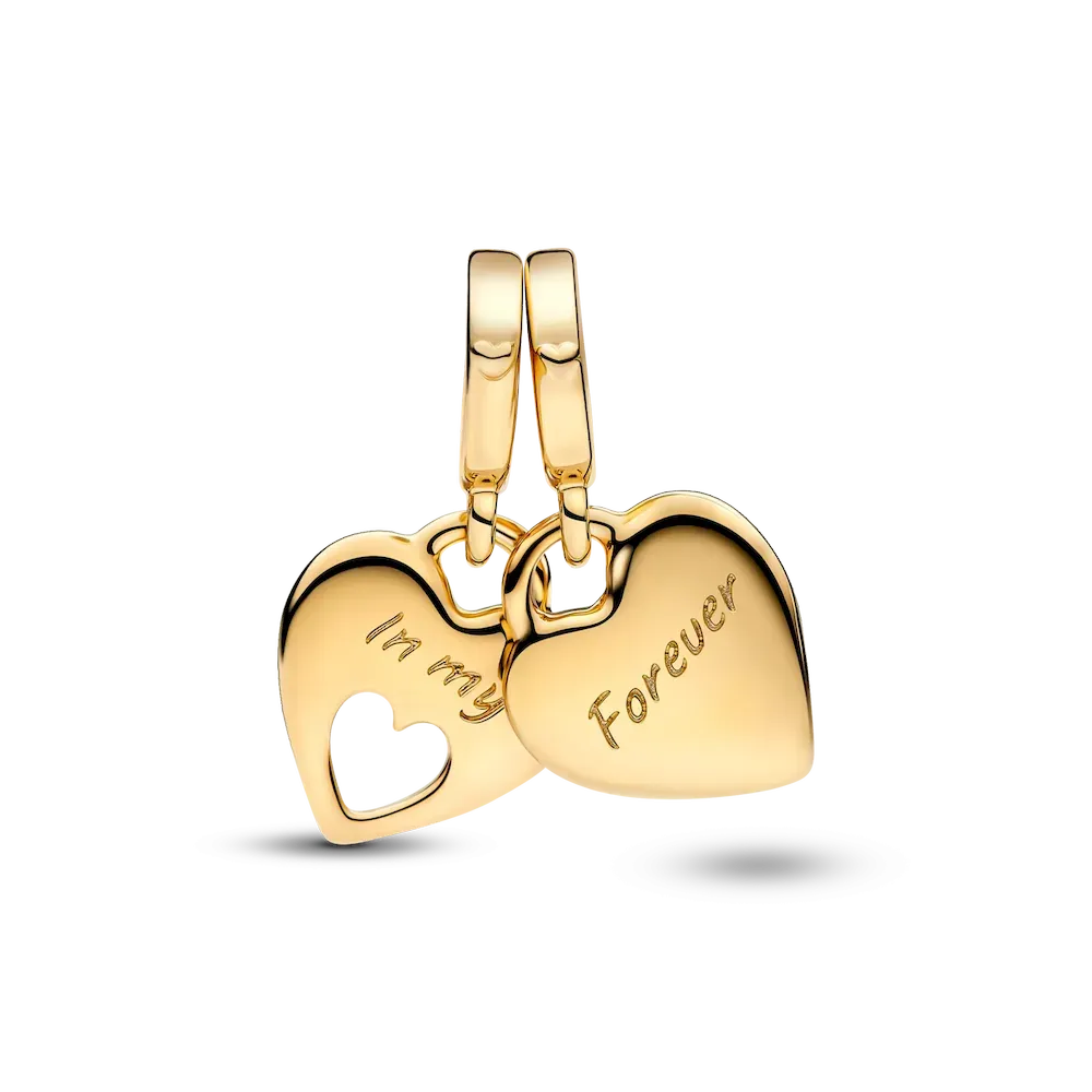 Remind her how much she means to you with this 14k gold-plated double heart charm, including two shareable pieces. The engravings across the two hearts read