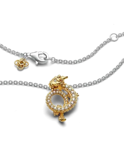 Invite good fortune in the coming year with the Two-tone Dragon Collier Necklace. 2024 is the Year of the Dragon – the 5th animal in the Chinese zodiac, this mythical creature represents good fortune, strength, power, wisdom and health. This sterling silver necklace features a curled dragon pendant in 14k gold plating with intricate details and a row of sparkling pavé along the dragon’s body. The pendant is not detachable and slides freely along the sterling silver chain, which is adjustable in length. A 14k gold-plated peace knot dangles near the clasp. Wear this necklace to invite the qualities of the dragon into your year ahead, or gift it to a loved one who was born in the Year of the Dragon.