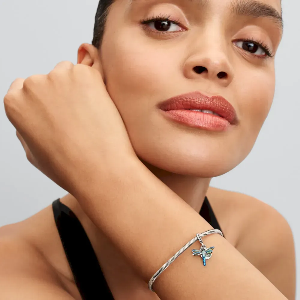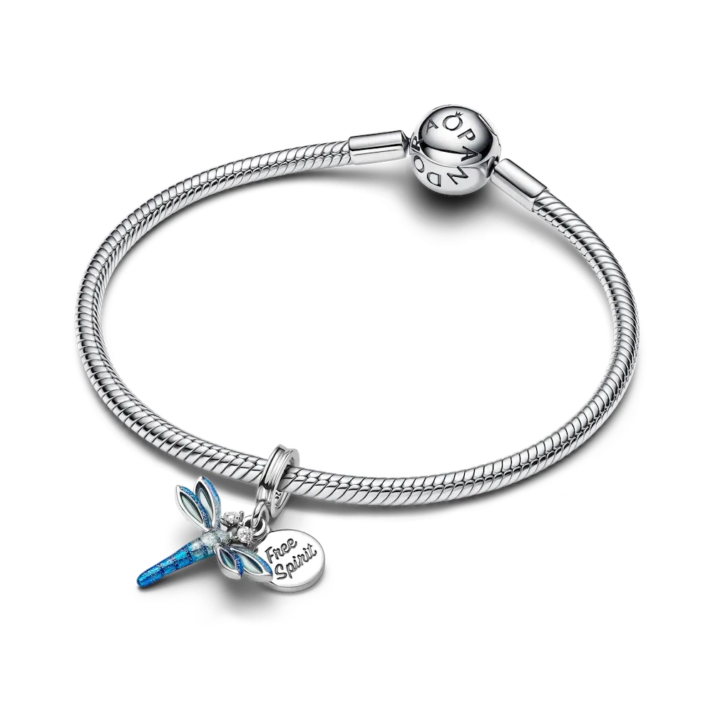 Embrace change and live in the moment with the Dragonfly Charm Necklace. This set combines a sterling silver dragonfly charm with a versatile chain. The charm features transparent enamel wings, a holographic glitter body, and sparkling stone eyes, while a round disc behind it carries the message “Free Spirit.” Paired with the adjustable chain with flat interlocking links and a dangling curb chain, this necklace can be worn solo or styled with other charms to create a personalized look. It’s the perfect piece to represent your free-spirited nature.