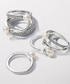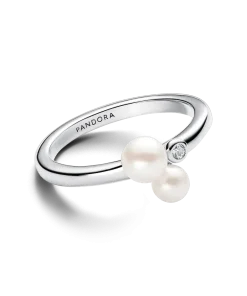 Celebrate closeness with our Duo Treated Freshwater Cultured Pearls Ring from the Pandora Timeless collection. Crafted in sterling silver, the slightly squared profile of the band showcases two asymmetrically placed treated freshwater cultured pearls, accompanied by clear cubic zirconia. This unique piece, embellished with the engraved Pandora logo, captures the essence of classic pearls, symbolizing beauty, wisdom, and love. Wear it as a symbol of your unique connection. Please note each treated freshwater cultured pearl is unique and can vary in size and color; normal wear and tear may occur with this material. Our freshwater cultured pearls are treated with bleaching and luster enhancement.