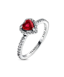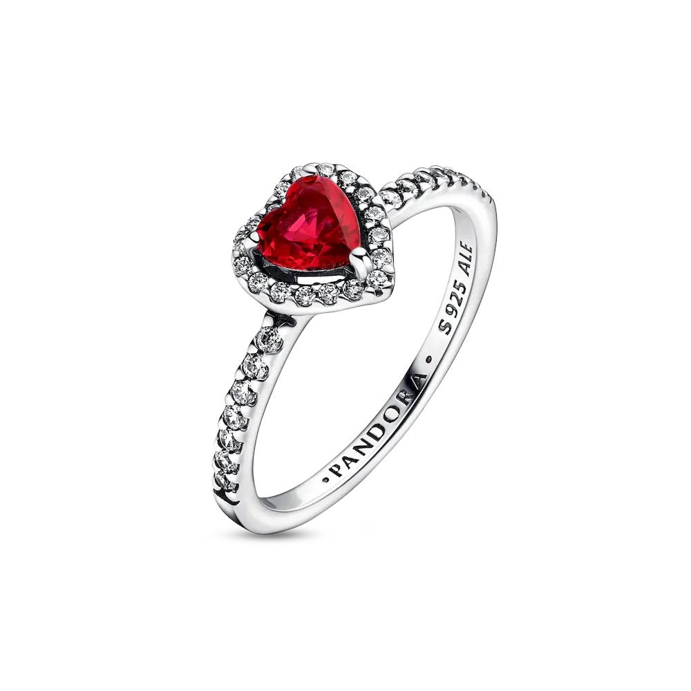 Add a dash of love to your look. In this sterling silver ring, a heart-shaped red stone takes center stage, raised slightly for extra impact. A cubic zirconia halo and sparkling pavé on the front half of the band make this piece a timeless one.