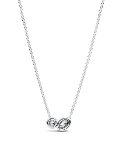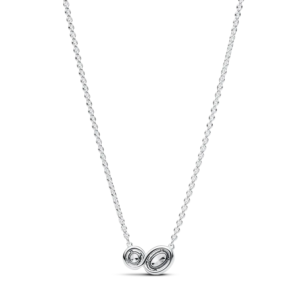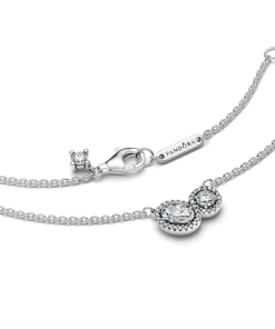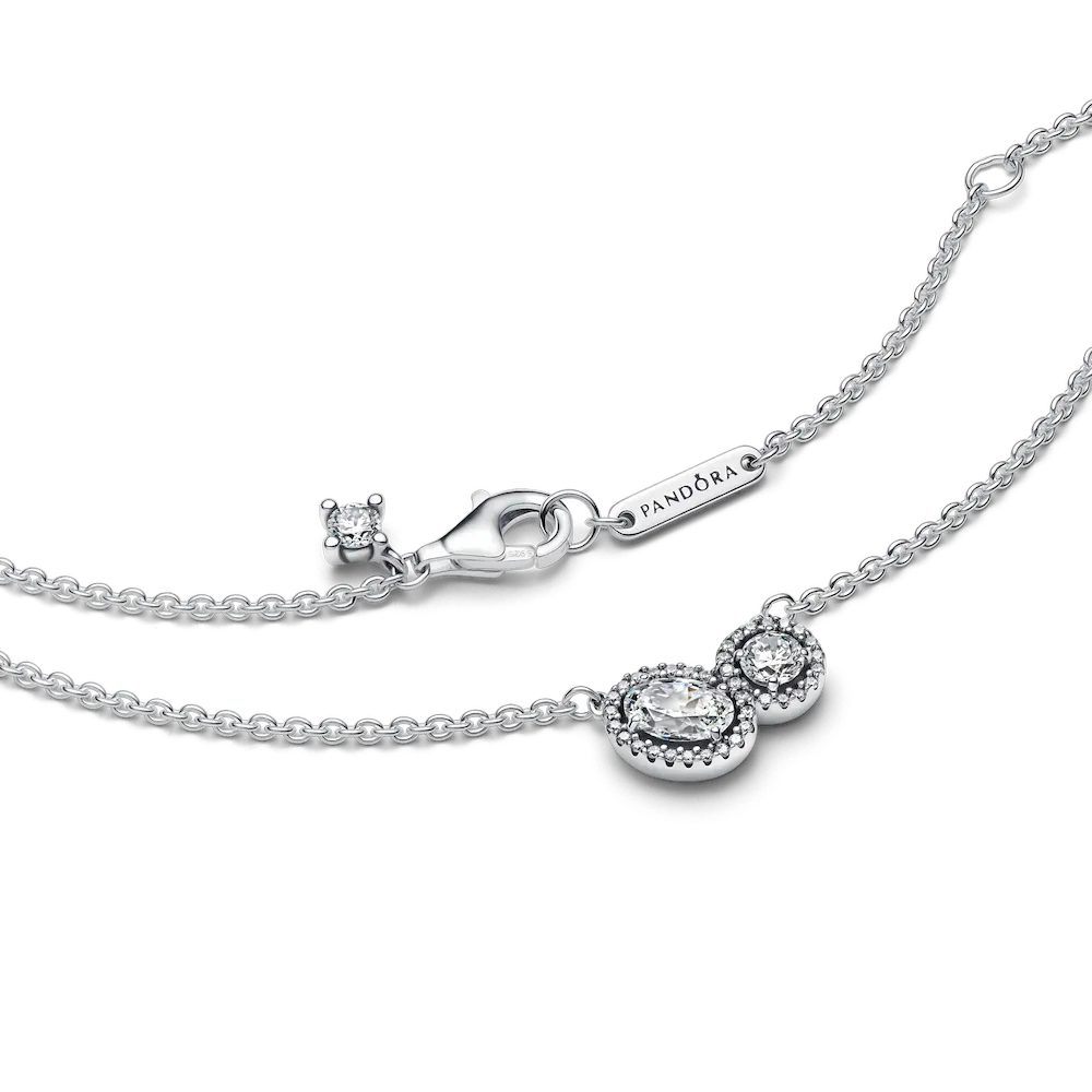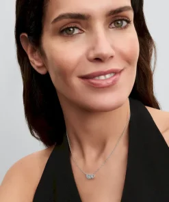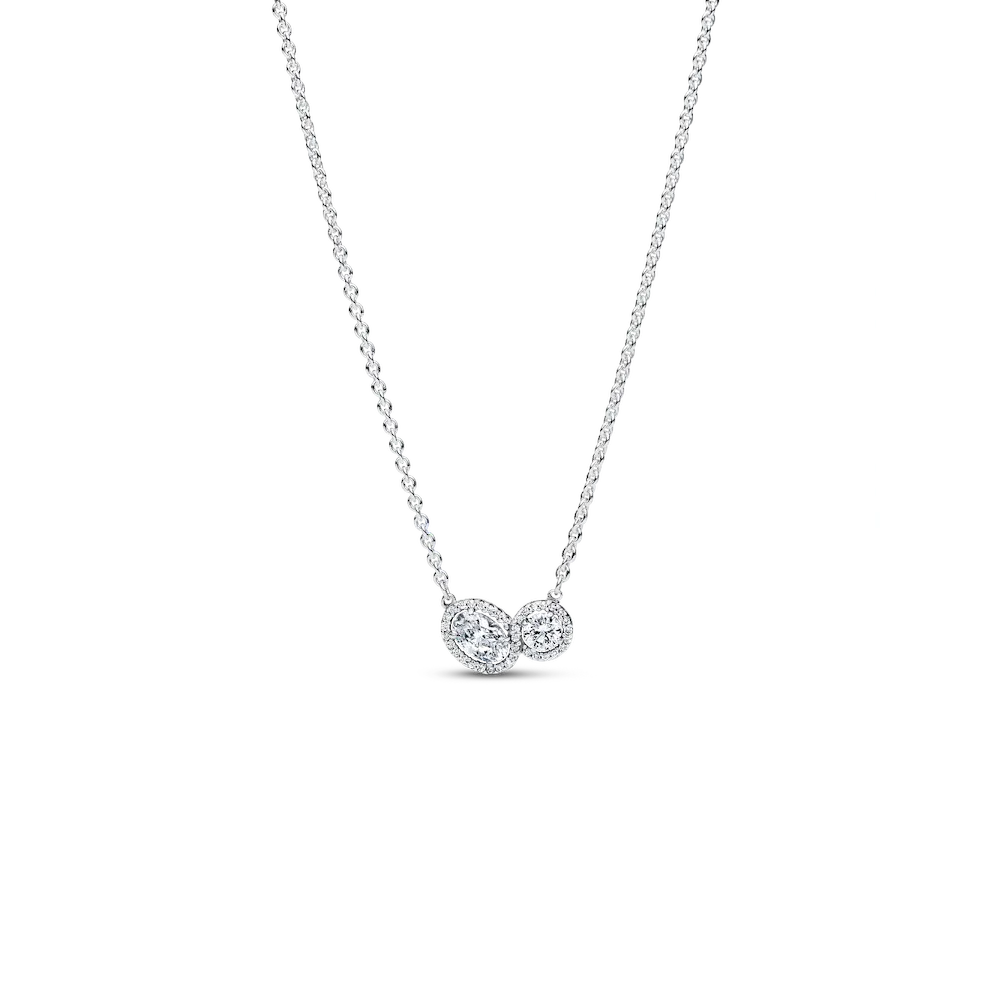 Embrace the power of two with the Embracing Halo Necklace. This sterling silver collier necklace features two sparkling stones –one round and one oval – connected by a pavé halo. An additional stone dangles near the necklace’s clasp. The cable chain is adjustable to two different lengths. Inspired by the precious links between us and our loved ones, as well as the idea of two souls coming together in an embrace, this necklace is as meaningful as it is timeless.