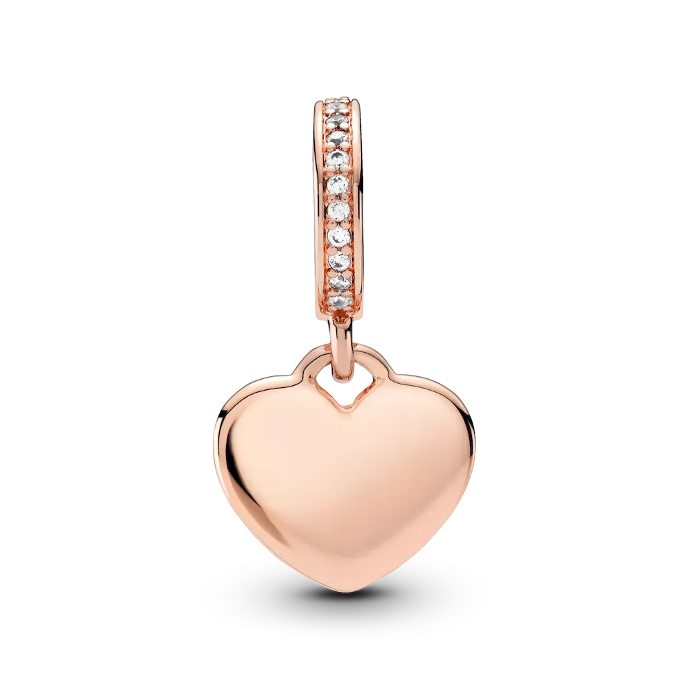 Spread the feeling of love with the Engravable Heart Tag Dangle Charm. Hand-finished in 14k rose gold plating, this polished heart-shaped dangle is engravable on the front and back and features sparkling clear stones on the bail. Customize this charm with a personal message as a token of self-love or give as a gift and add a heartfelt engraving to show someone close to you that you care.