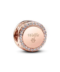 Add this simple-yet-sleek charm to your Pandora collection. This polished Engravable Sparkling Button Charm is hand-finished in 14k rose gold plating, and features 52 bead-set round brilliant-cut clear cubic zirconia stones in a delicate ring. This Pandora piece is all about self-expression: choose to keep it blank and let the symbol speak for itself or engrave the front, the back or both. Pandora Engraving is only available in select stores and markets.