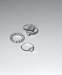The Engraved Together Ring Set offers personalized elegance. Featuring heart-shaped designs surrounded by pavé, each ring can be engraved with a meaningful message, creating a unique and sentimental piece.