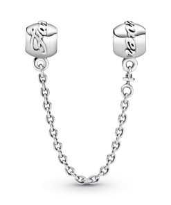 Keep charms in check while showing the importance of family with our safety chain for Pandora Moments bracelets. Cast from sterling silver, the charms are detailed with a swirling script that reads