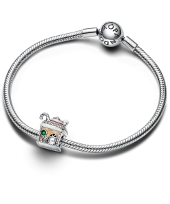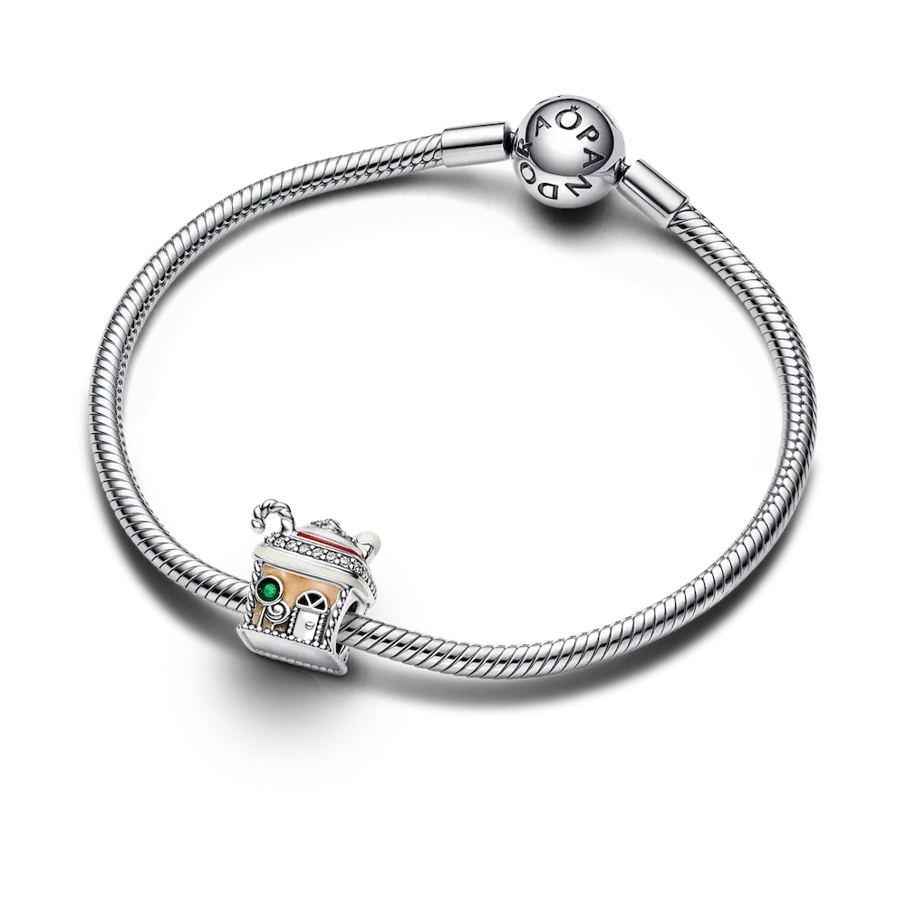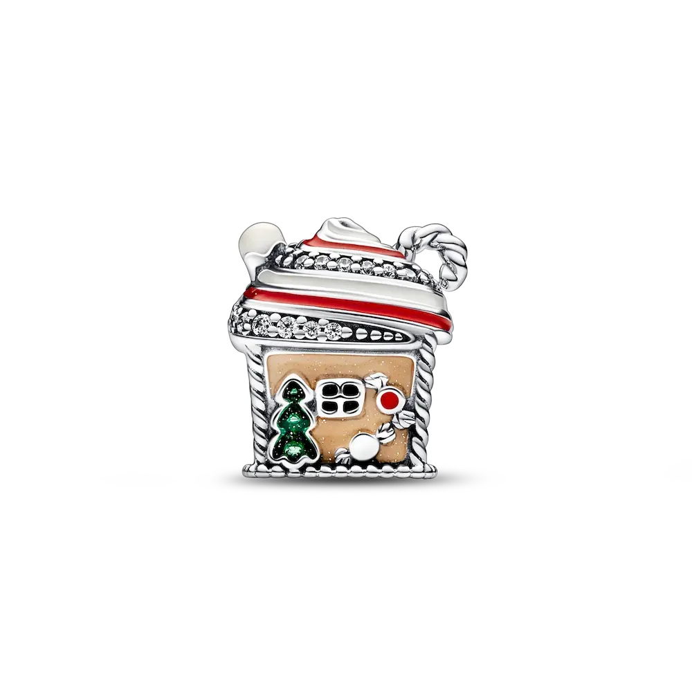 Celebrate what makes the holidays sweet with this Festive Gingerbread House Charm. This cute sterling silver house-shaped charm is decorated with realistic caramel brown, red and green enamel and features delicious details including candies and lollipops on the walls, a door with a tiny heart-shaped handle and a swirled icing roof complete with a chimney and rows of sparkling pavé. A Christmas tree detail on one wall adds the final festive touch. Wear a reminder of cozy holiday traditions on your jewelry and celebrate the happy memories of the season.
