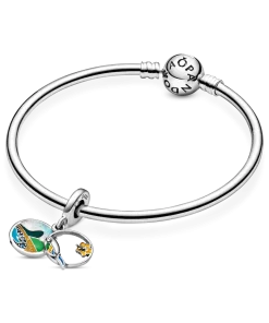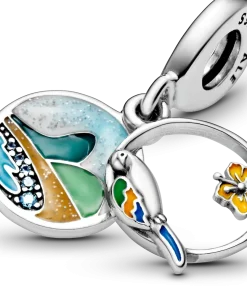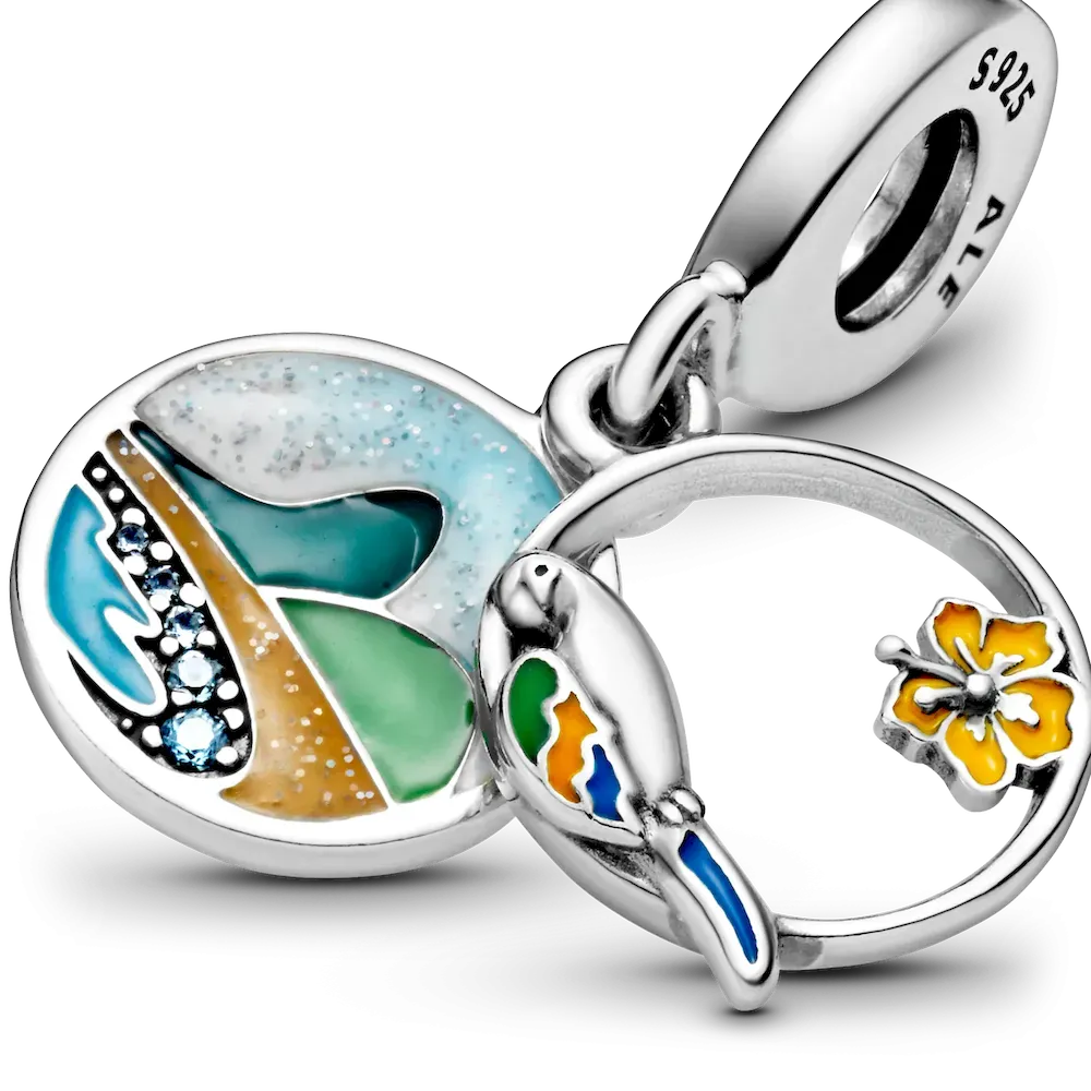 Commemorate the trip of a lifetime or honor your Brazilian heritage with this Brazil Beach & Parrot Dangle Charm. Featuring a double dangle design, one dangle shows a beautiful Brazilian beach scene with sparkling icy blue crystals. The second dangle is open front and depicts a parrot and hibiscus flower with colorful enamel detailing. The rear of the dangle charm is engraved with the words “Love Brazil” to remind you of the special country.