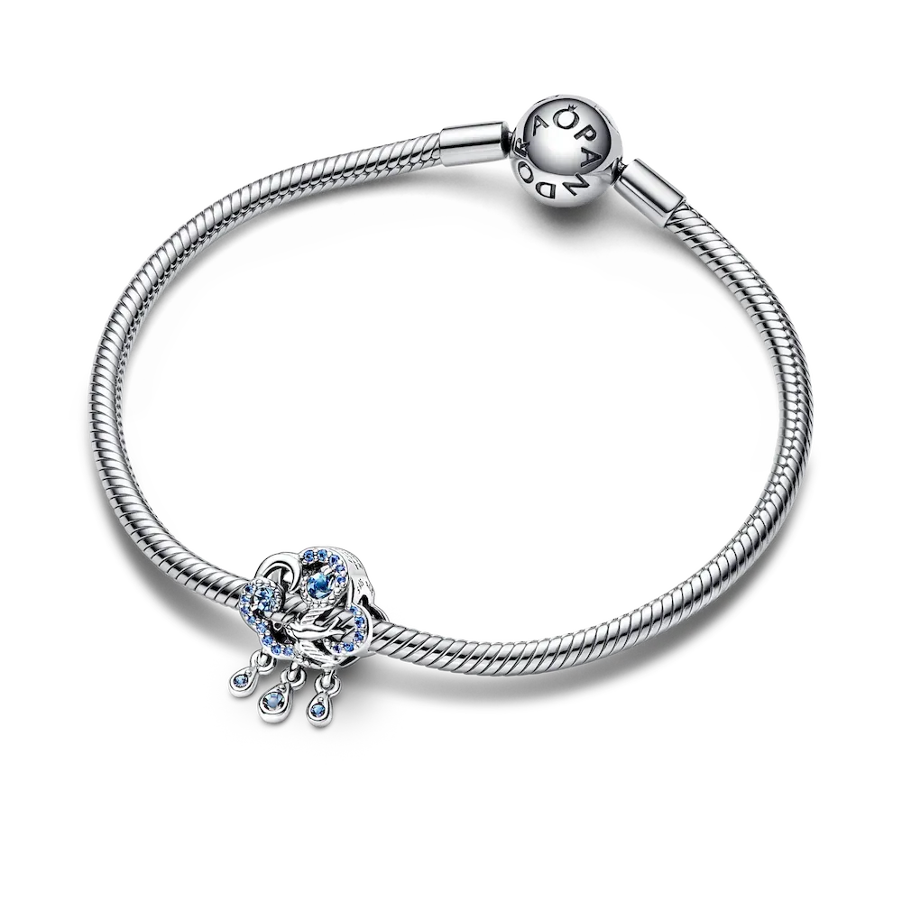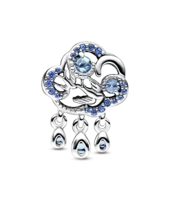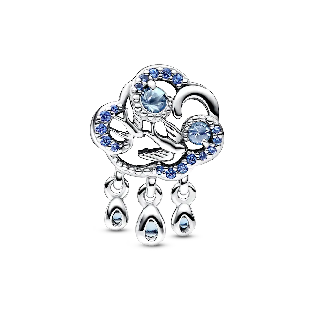 Immerse yourself in spring with our Cloud & Swallow Charm. This sterling silver charm features an intricate swirling cloud scene detailed with soaring swallows and sparkling pavé in varying shades of blue. Three raindrops set with blue man-made crystals dangle from the cloud. Engraved with