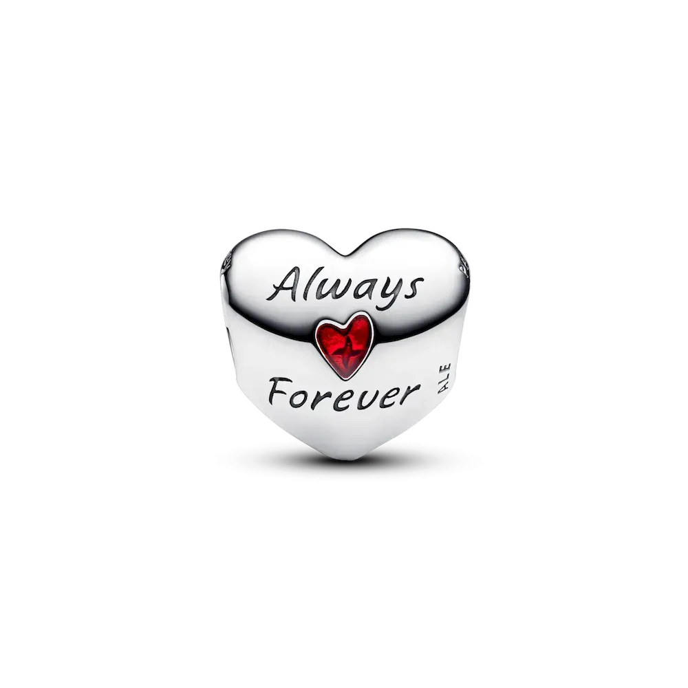 Celebrate a forever love with the Disney Mickey Mouse & Minnie Mouse Heart Charm. Mickey and Minnie’s love comes to life in this heart-shaped sterling silver charm, featuring a silhouette of the iconic duo in black enamel, sitting back-to-back and holding hands. The other side features the engraving “Always + Forever” and a red enamel heart with the
