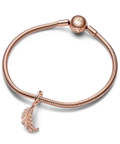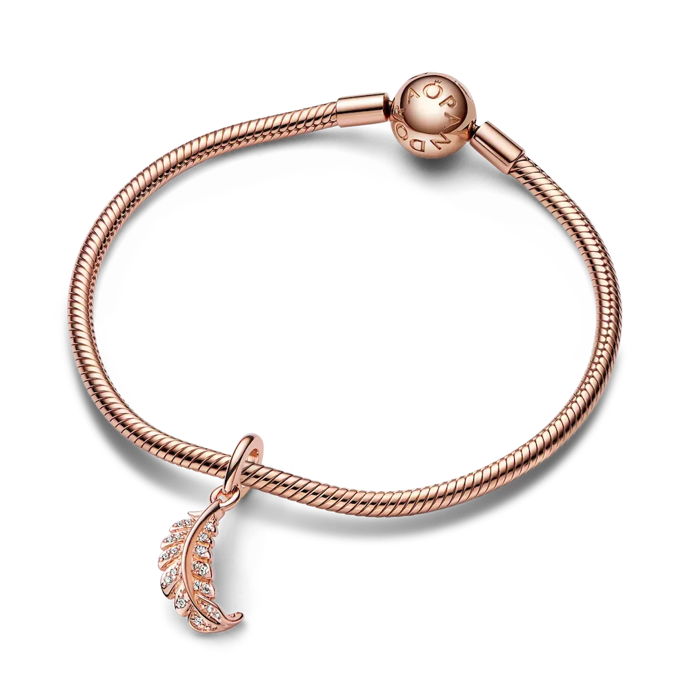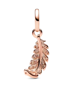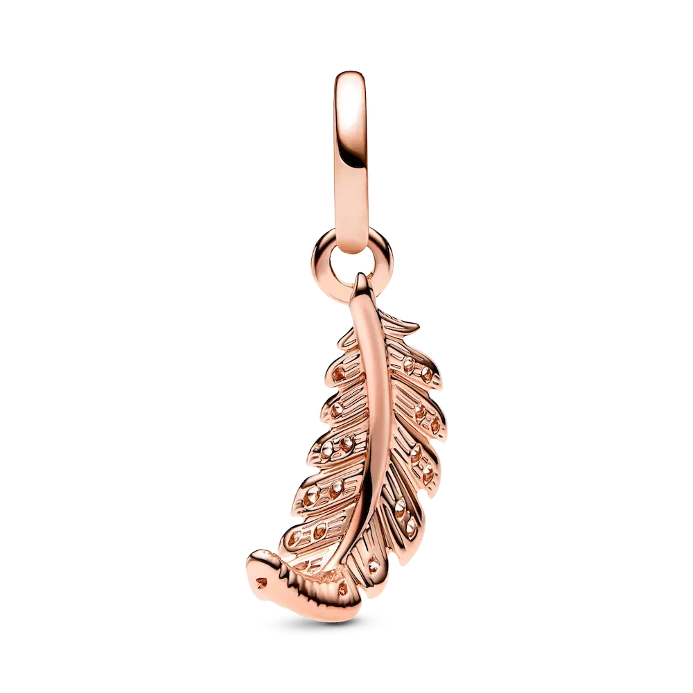 Catch the season’s light with our Floating Curved Feather Dangle Charm. This 14k rose gold-plated dangle charm features a feather curved to look like it is suspended in the air, delicately falling to the ground. The front of the feather is set with round brilliant-cut clear cubic zirconia following its whimsical shape. Style it with other 14k rose gold-plated pieces to enhance your spring glow.