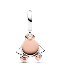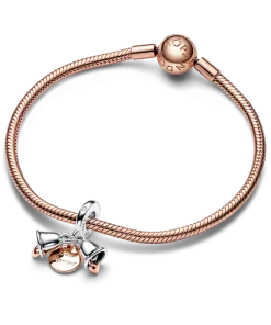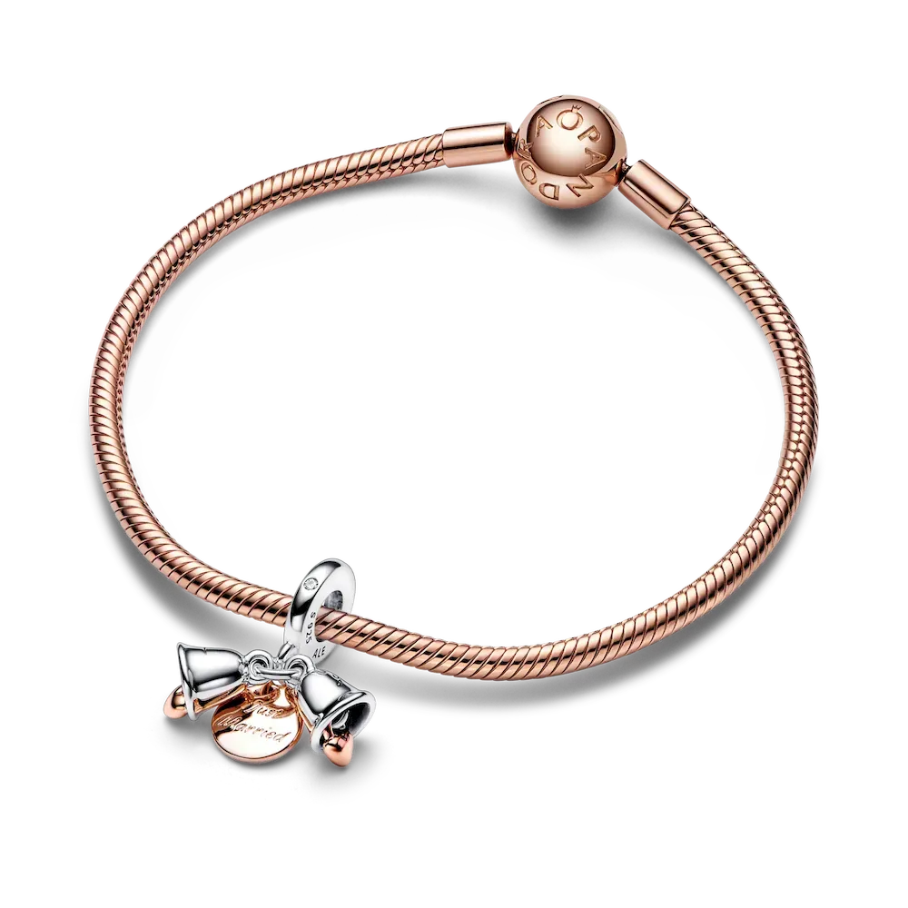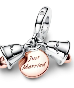 Let the bells ring for the happy couple! The Two-tone Wedding Bells Double Dangle Charm is a celebration of a new milestone in your love story. It features two dangling wedding bells in sterling silver, each with a small 14k rose gold-plated heart dangle inside – one bell is engraved with