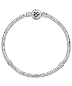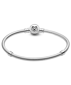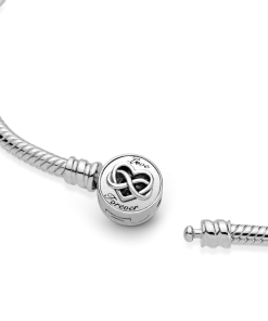 Gift a symbol of your love with the Pandora Moments Heart Infinity Clasp Snake Chain Bracelet. Hand-finished in sterling silver, this design includes a round flat clasp and our popular snake chain. An openwork heart with an entwined infinity symbol and the engraving “Love Forever” feature on the front, with a raised heart and infinity motif on the back. This bracelet includes threaders and stoppers to keep much-loved charms in place. Gift this style to someone special to show how much you care.